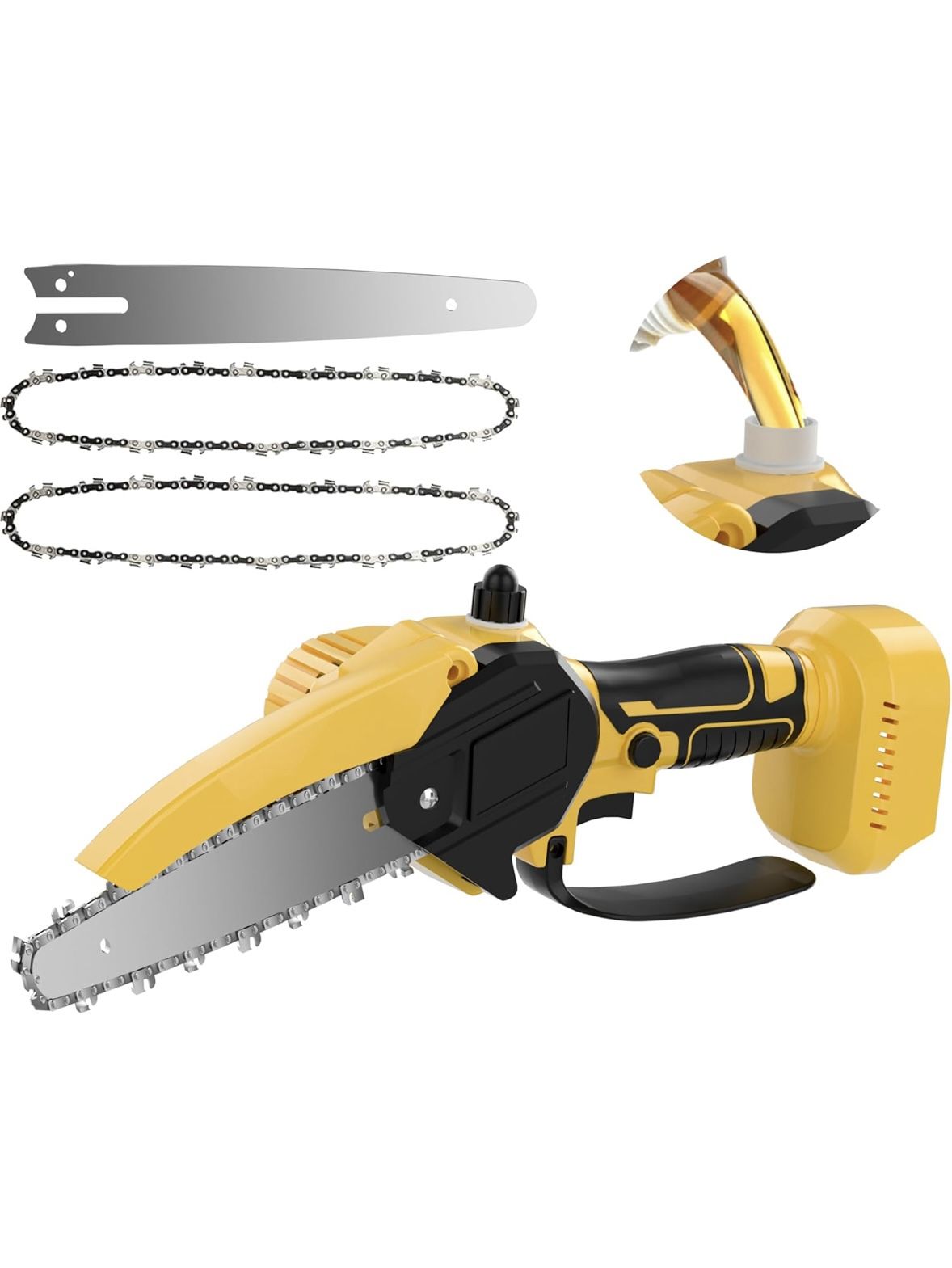 【6 Inch Chainsaw】This versatile chainsaw comes with both 6-inch chains, offering greater flexibility for pruning, tree trimming, and firewood processing. The upgraded high-strength guide bar withstands higher cutting pressure for faster, more efficient work 【Auto Oiling for Continuous Lubrication】Our electric chainsaw cordless is equipped with an automatic chain lubrication system. Just fill the reservoir with lubricating oil, and it can provides up to 40 minutes of uninterrupted operation per oil fill. This reduces friction and wear on the chain and guide bar, optimizing cutting performance and significantly extending the tool's lifespan 【Advanced Brushless Motor】 Our chain saw cordless features is equipped with a high-efficiency brushless motor that extends runtime by up to 300% for longer efficient operation. It delivers a powerful no-load speed of 44.3 ft/s for fast, smooth cutting and includes built-in overload & overheat protection to prevent burnout, ensuring a dramatically extended motor lifespan 【Tool-free Chain Tensioner】It has a rotary switch allows for quick, on-the-fly chain tension adjustments without any tools, ensuring optimal cutting performance and safety.(Note: For best results, check and adjust the chain tension after using the chainsaw for a while.)