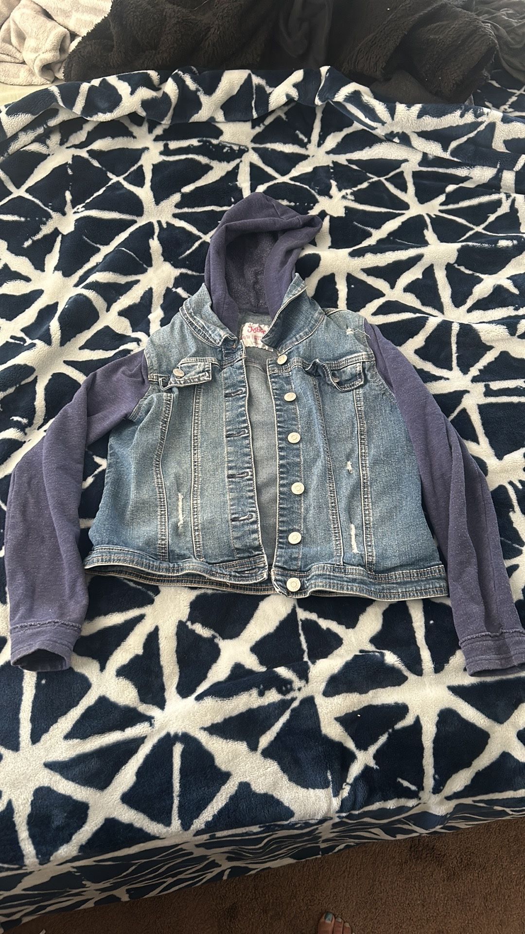 Girl lightweight denim jacket with sweatshirt hoody and arms. Size 14/16