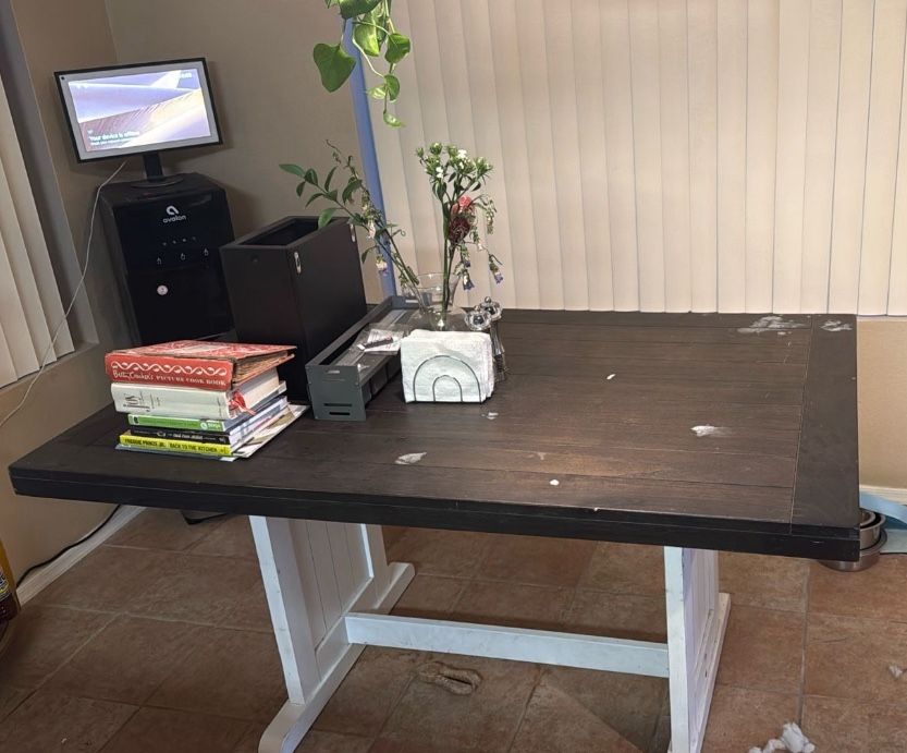 wood farmhouse-style dining table with matching bench. We just moved into a new home and unfortunately it doesn't fit our new space. The table is sturdy condition. There are a few blemishes on the surface that could easily be refinished if you'd like to give it a fresh look. My original plan was to restain or repaint it, but it just won't work in our new dining area. Perfect for family gatherings or anyone looking for a classic, rustic centerpiece! , Size: 60in x 38in long 30in tall Price: 150 OBO • Pickup location: Ahwatukee