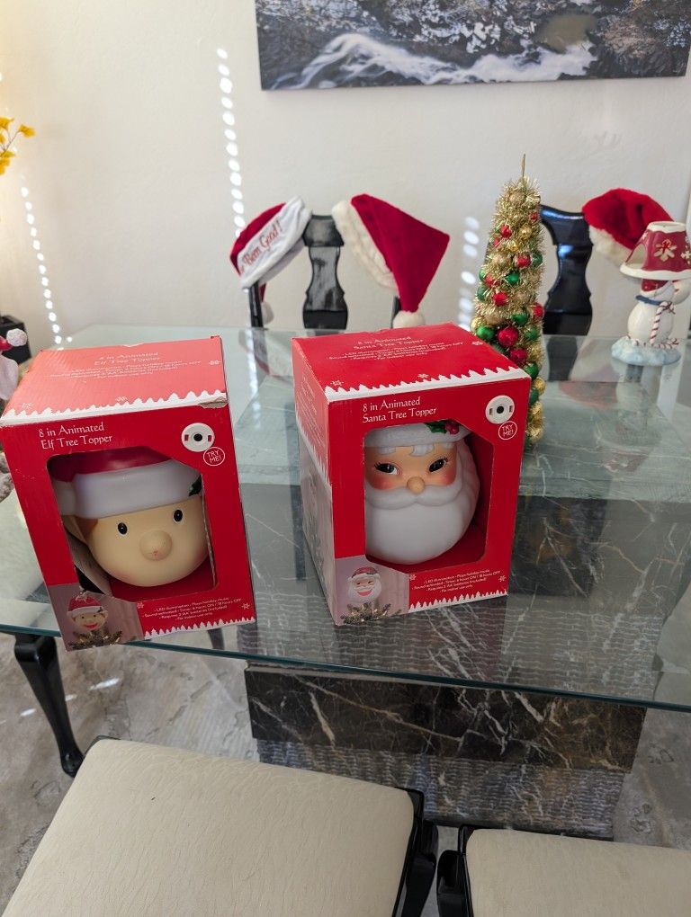 Set of 8-inch animated Santa and Elf tree toppers. LED Illumination, Plays Holiday music, Sound activated. $20 EA