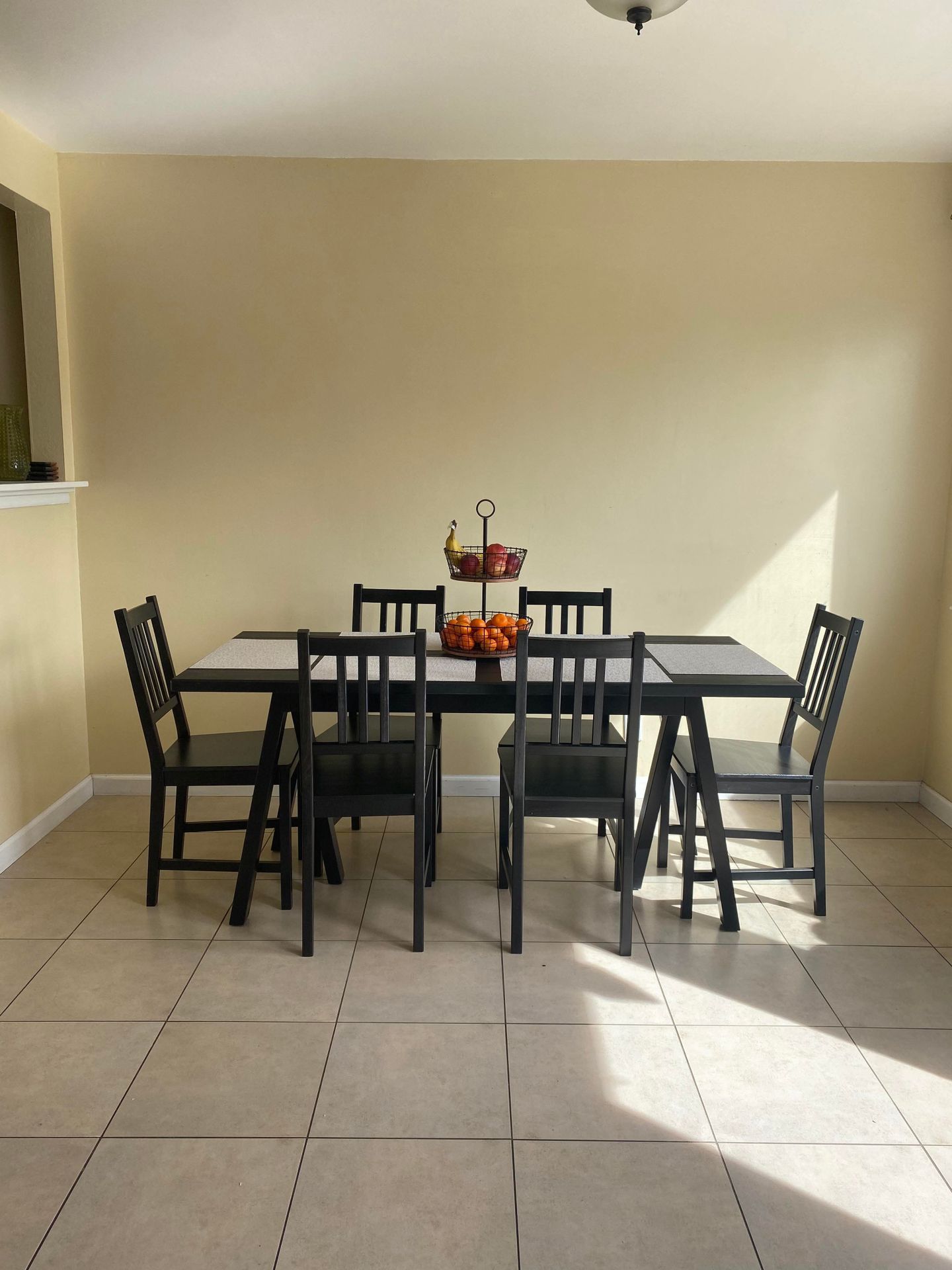 Great used dining table! Can fit up to 6 people comfortably. Comes with 6 Ikea Stefan Chairs. Length: 66 7/8 " Width: 30 3/4 " Height: 29 1 “