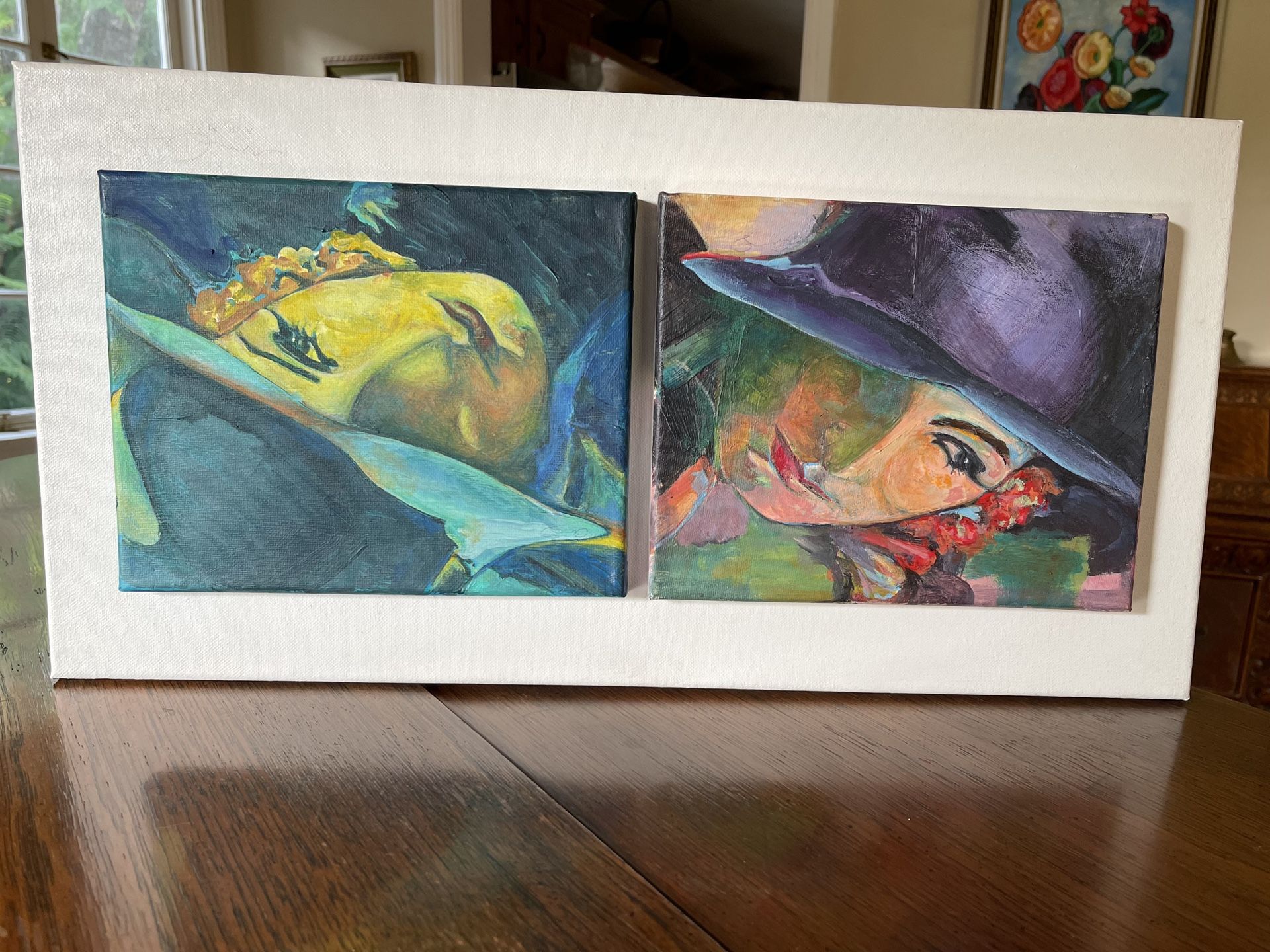 2 8x10 mounted on a Rectangular canvas , presented as one piece. Unique , one of a kind. Paintings exhibit in all directions. Every direction can be the UP.