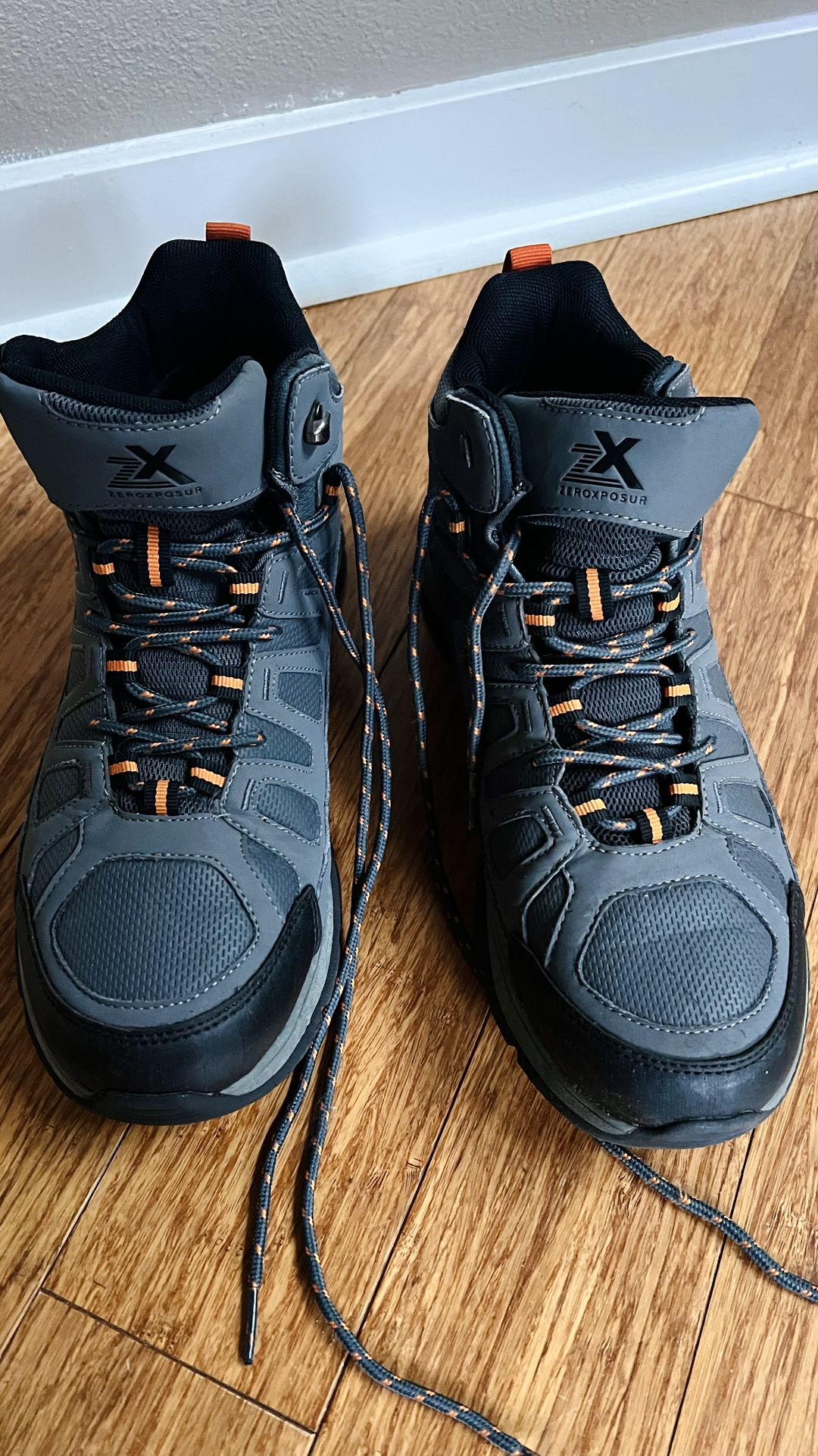 Zeroxposur grey hiking boots with orange accents. New. Size 9.5. Comes from a clean, smoke-free, pet-free home.