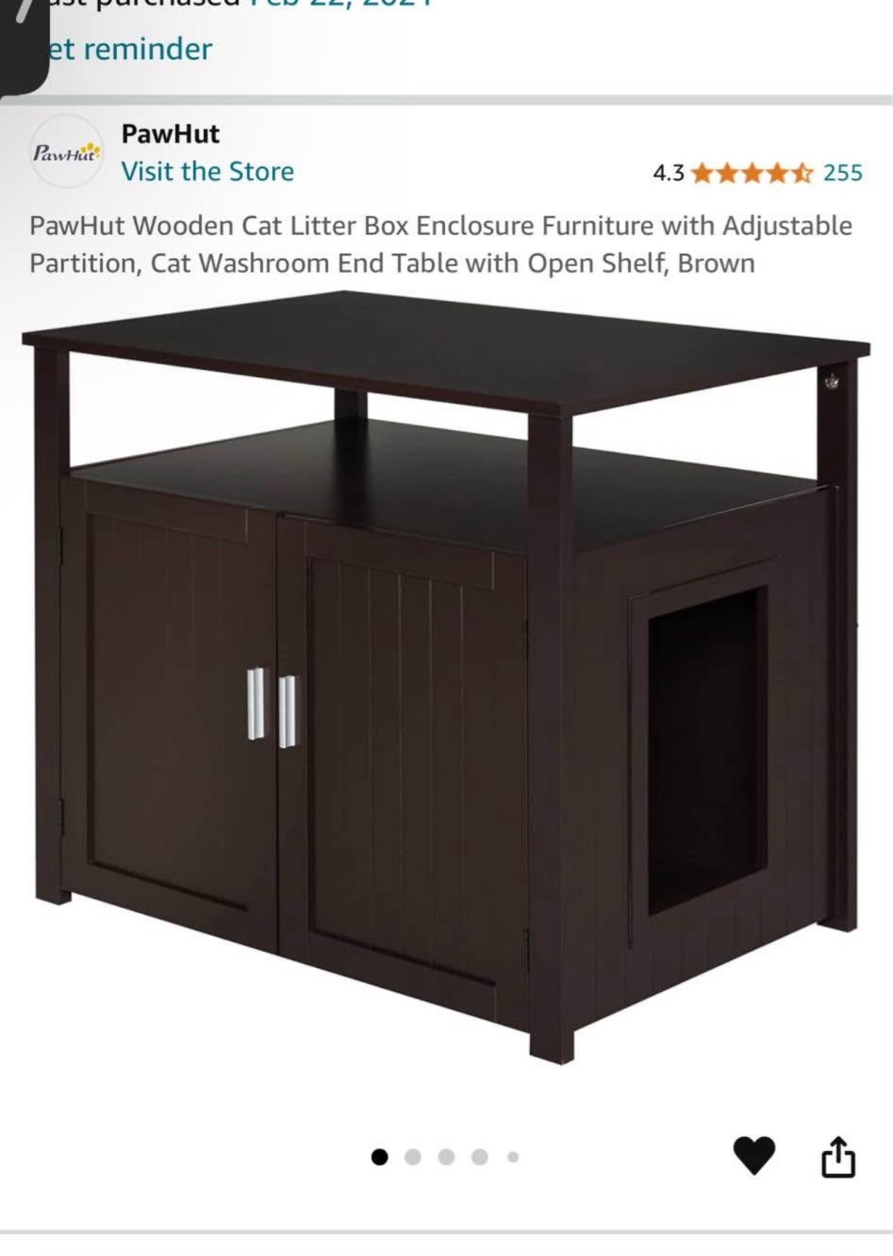 Kitty hut litter. See photos for details and measurements. Like new. I assembled it once only to Take it down a few weeks later! Had to move on a whim cause father was ill. It has been in storage in a box for 3 years, temp protection and now finally shipped over to east coast along with other items. I just don’t need this. It’s a. Great product!