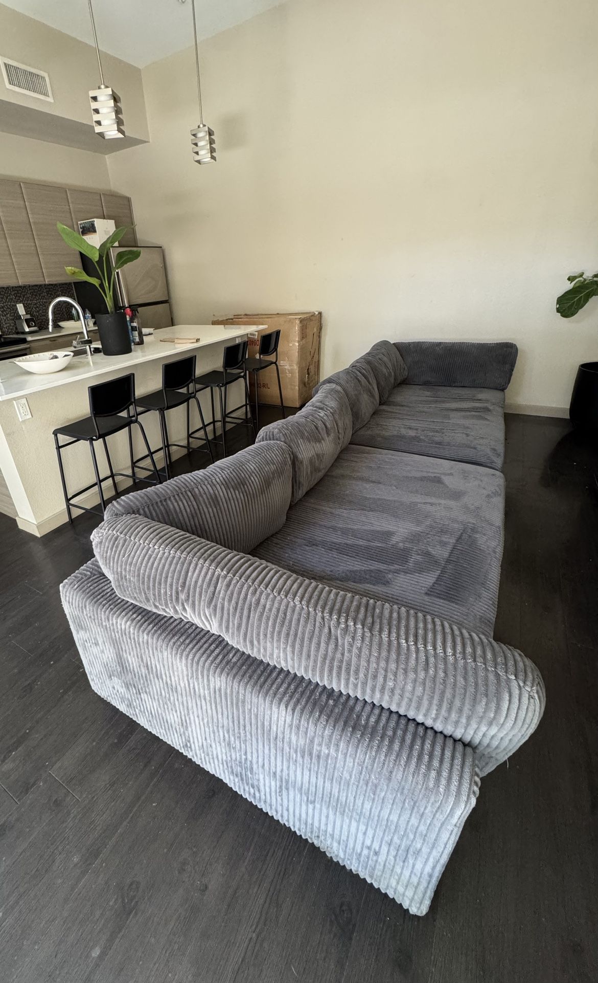 Comes with the little pillows they’re just not pictured, too big for my apartment as you can see. Really comfortable, the seating is larger than a regular couch.