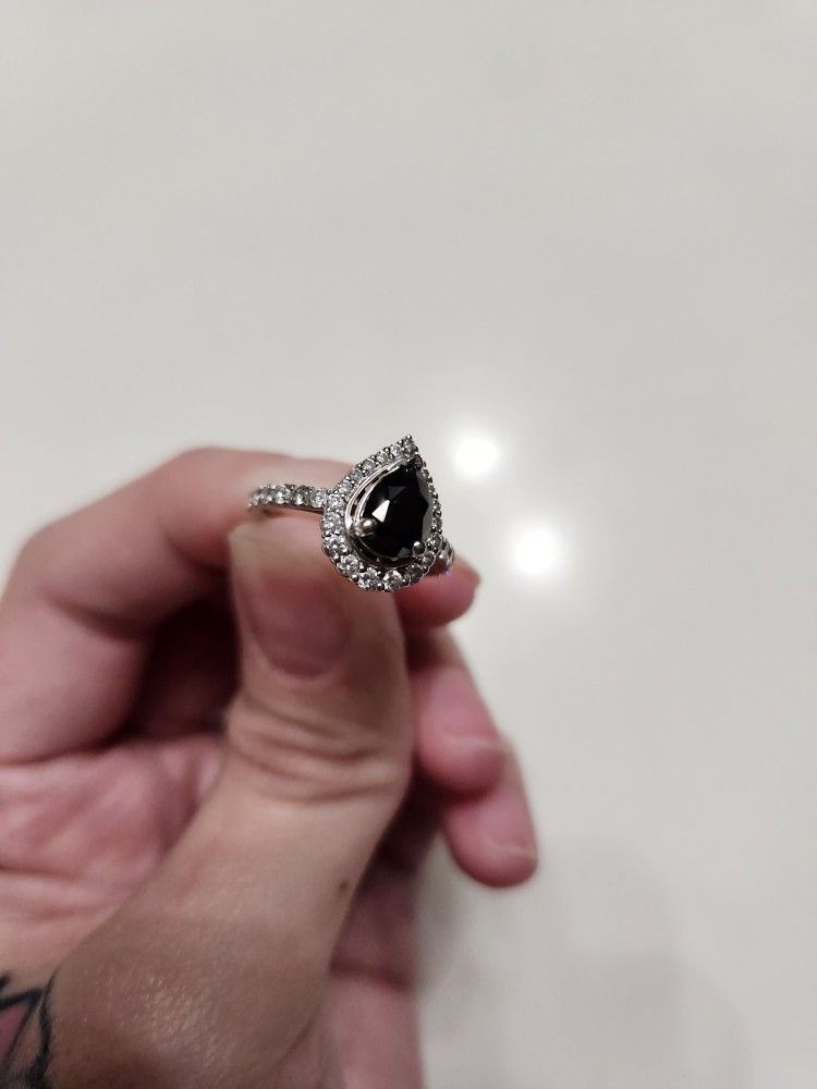 Size 4.5 Only worn for a few months Will get cleaned and put in a box! 14k white gold band Pear shaped black diamond engagement ring