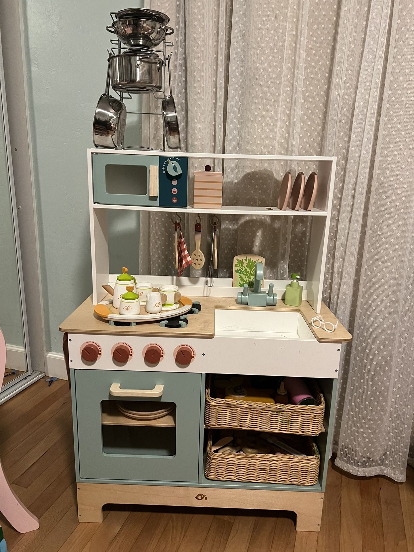 Adorable kids play kitchen set with lots of accessories and pretend food items. Included: play kitchen with a stove top, oven, microwave, sink, and shelving. Accessories include: pots and pans set, tea set, baskets with various pretend food items like bread, fish, fruit, a waffle maker and waffle, asparagus, noodles, many utensils, soap dispenser, plates, and probably other things I’m forgetting. My daughter spent many years making us meals, snacks and treats in this play kitchen, and I hope another kid can have fun with it for many more years to come. It’s in great shape and would make a lovely gift.