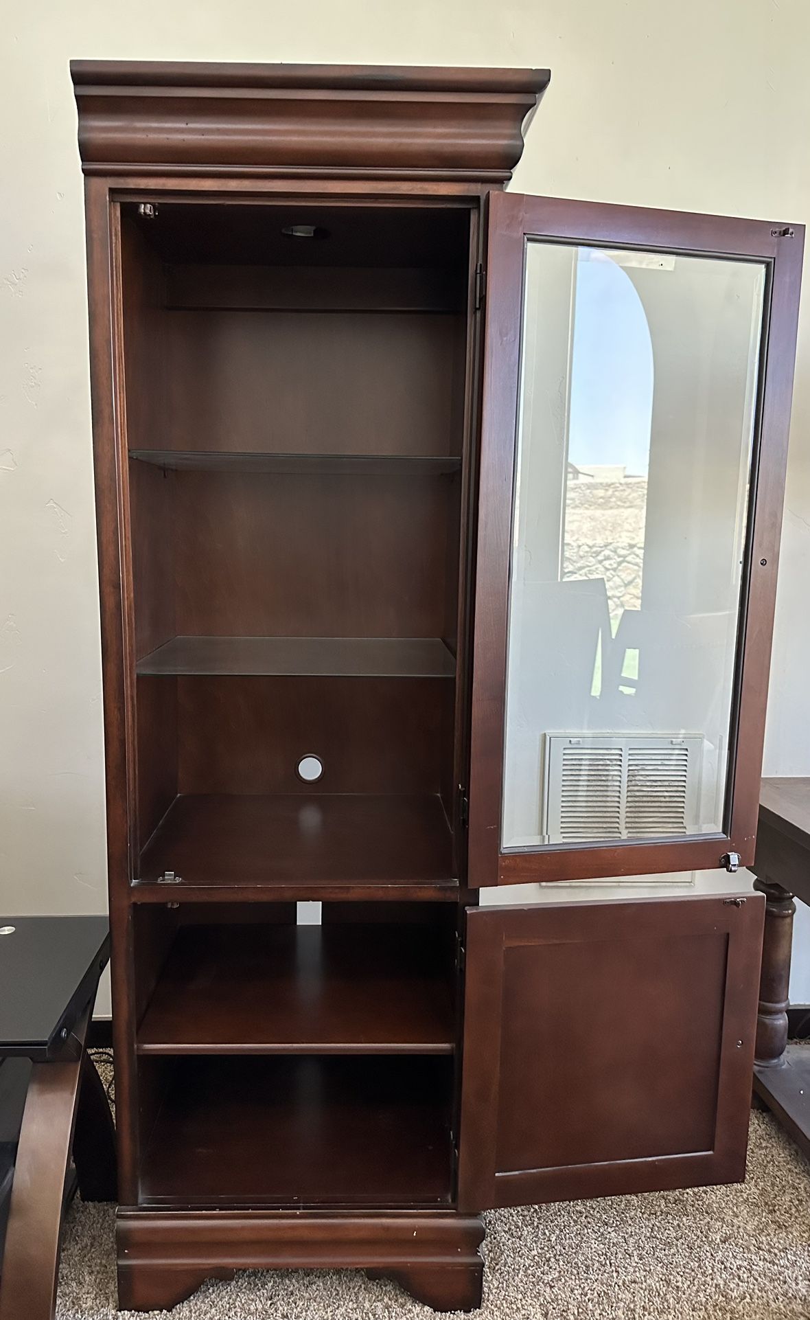 Free standing left and right tower with glass doors and glass shelves adjustable. Wooden door with shelf.