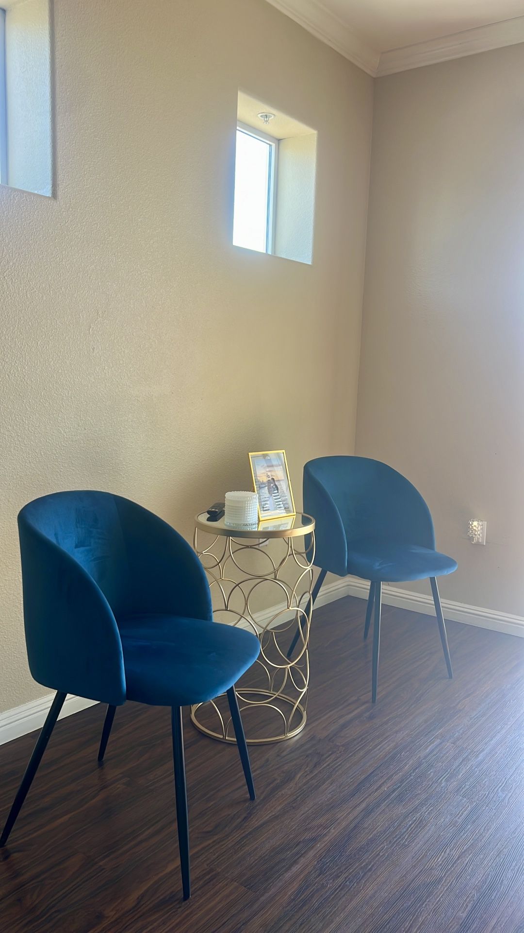 Beautiful modern velvet accent chairs in a deep teal/blue color with black legs. Very stylish and comfortable, perfect for a living room, office, beauty studio, or reading corner. • Soft velvet fabric • Modern curved design • Strong black metal legs • Very comfortable seating They are in great condition and look very elegant in any space.