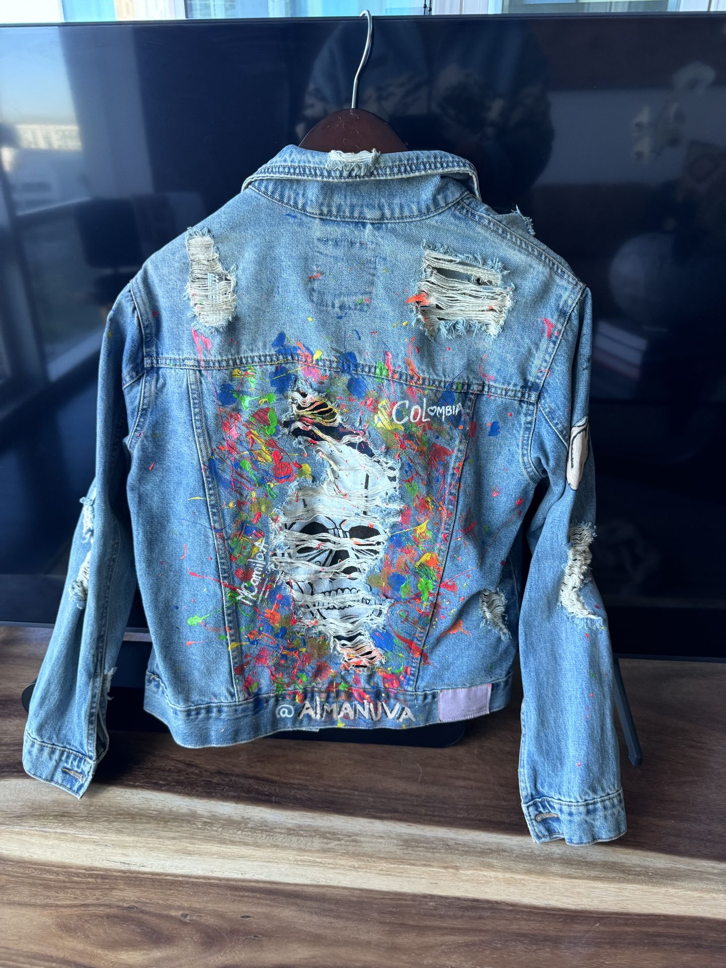 Awesome custom made jacket! Small europe, medium US size. Hired a local artist while living in Colombia to create this look for me, her signature at the bottom .