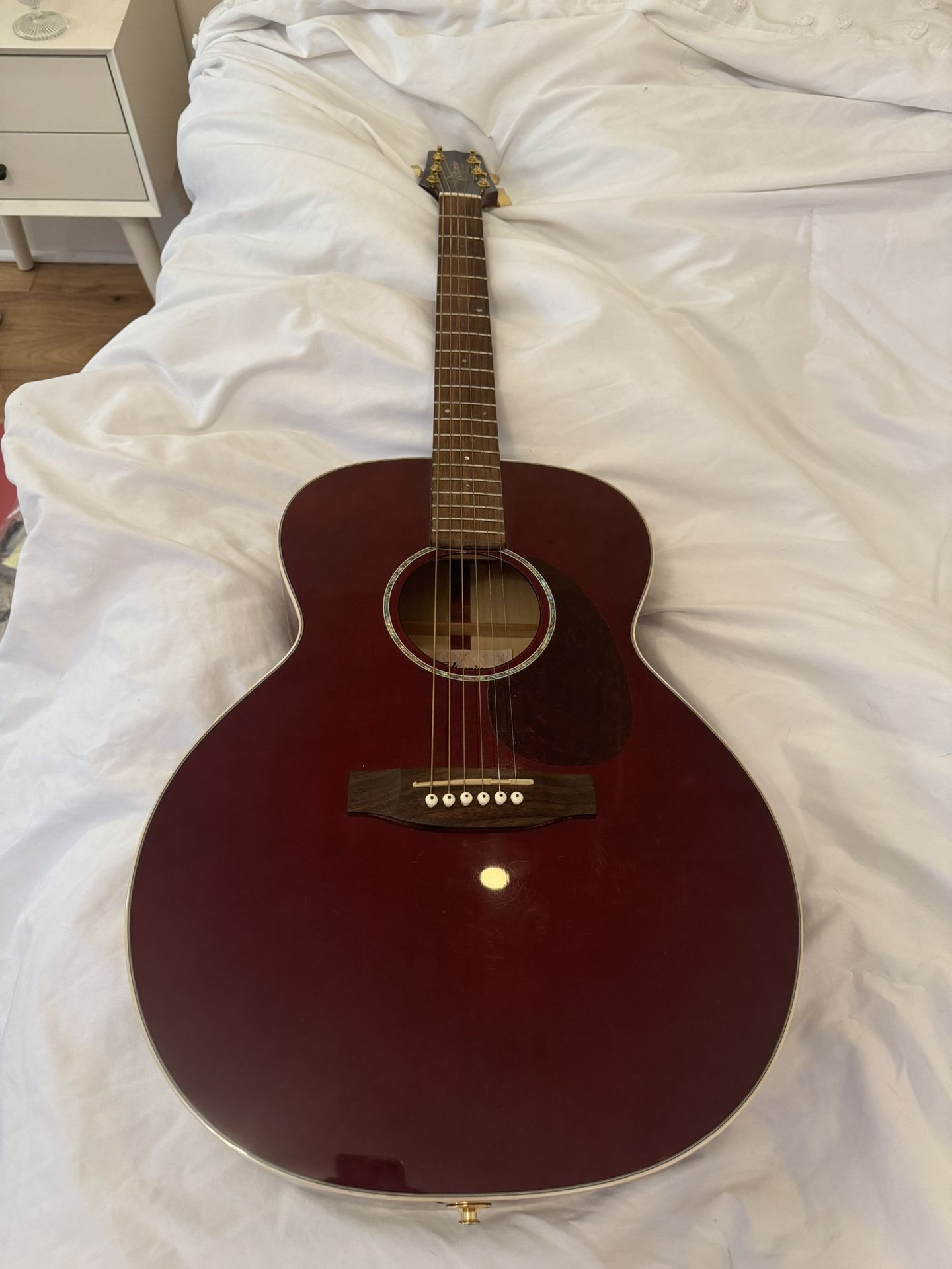 Beautiful Red Takamine guitar from G Series. In great condition, hasn’t been used much. Has great sound! Comes with a case Only flaw is a small crack on the bottom which is shown in photos. It is not very noticeable.