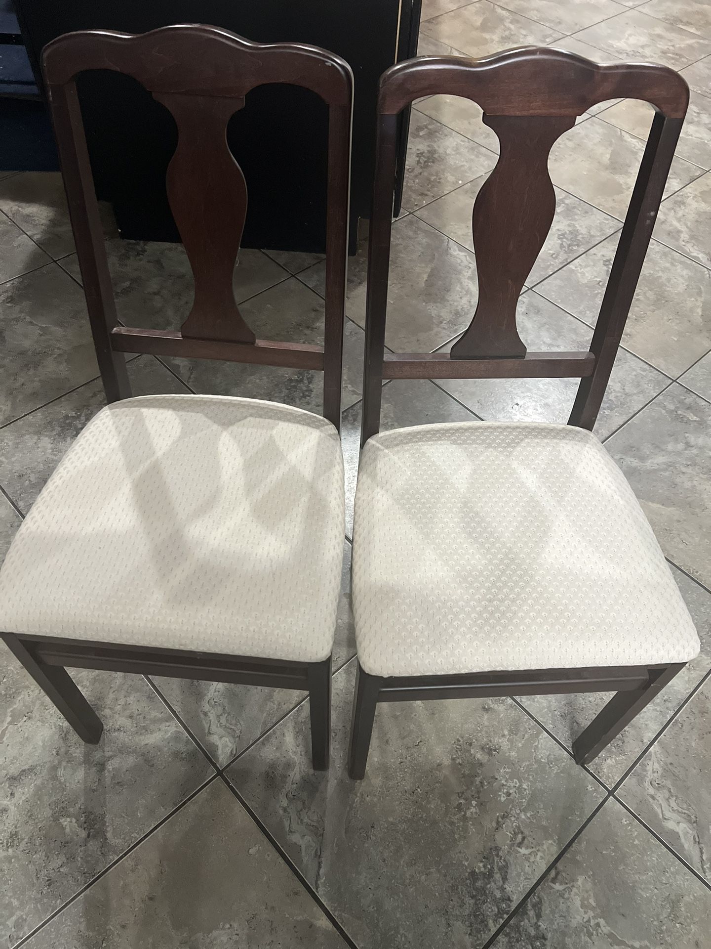 This 2-pack Stackmore wood folding chair with upholstered seat is a stylish and practical addition to any home or office. The chairs are made with high-quality wood and feature an upholstered seat for added comfort. They have a beautiful brown color that blends well with any decor and easily fold for convenient storage. The chairs are perfect for extra seating during parties or gatherings and can be used in a variety of settings. They are both in good condition with cosmetic blemishes associated with normal usage. These blemishes are to include minor scratches and scuff marks. The upholstery in in great condition with minor blemishes nothing crazy.