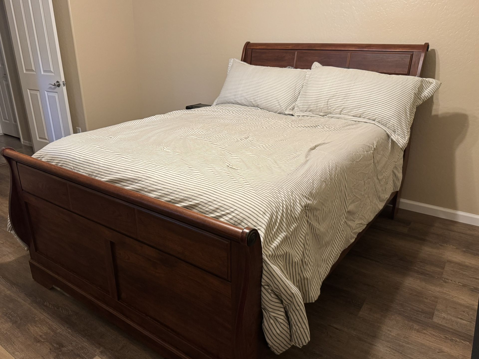 Queen size bed includes frame, mattress and box spring. In good condition. I cannot deliver!