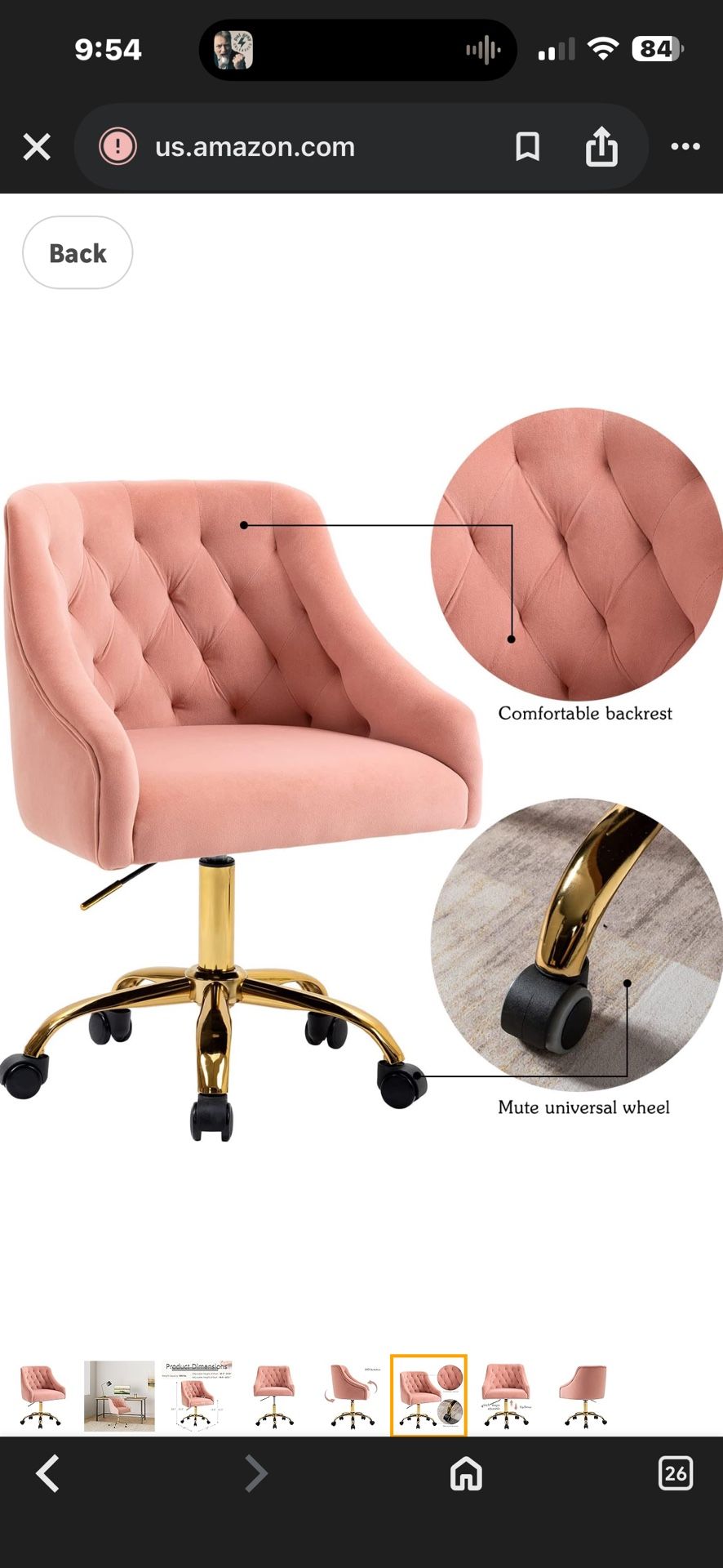 New in the box pink velvet swiveling adjustable height office chair or vanity chair with gold base