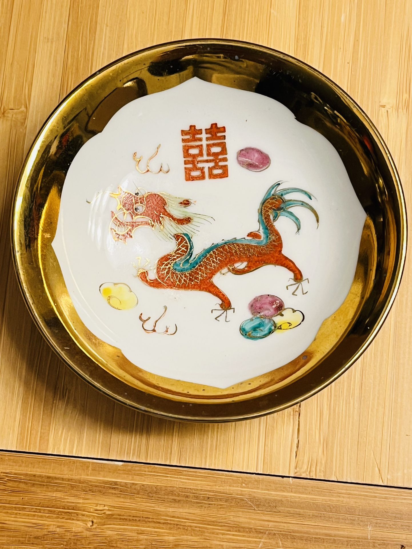 Mini Vintage Bowl (saucer) Hand Painted CHINESE DRAGON AND PHOENIX Porcelain Heavy GOLD