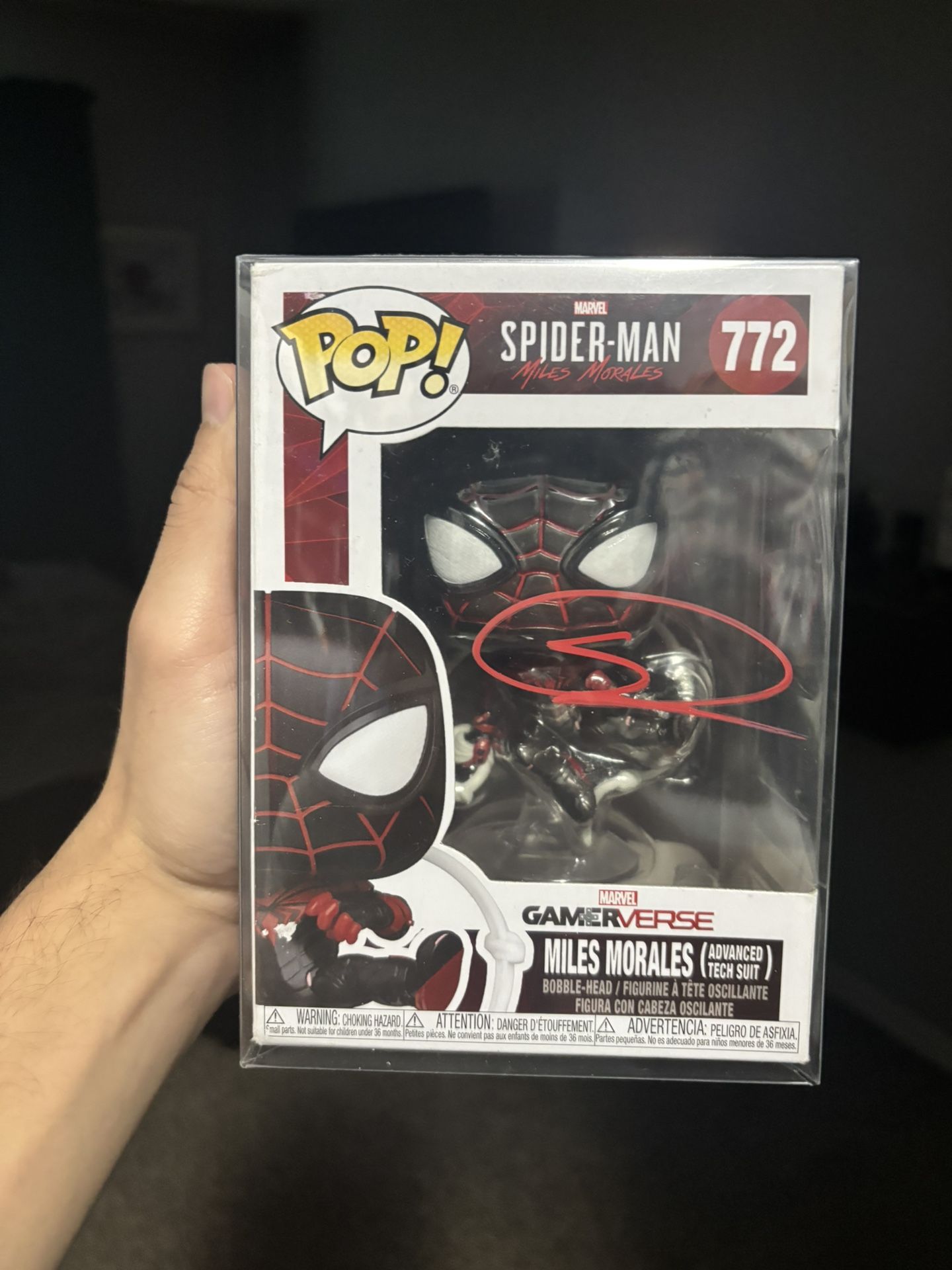 Miles Morales Funko Pop signed by the Shameik Moore, voice actor for Miles Morales in all the Spider-Verse movies! Perfect collectible and gift for all Spider-Man fans.