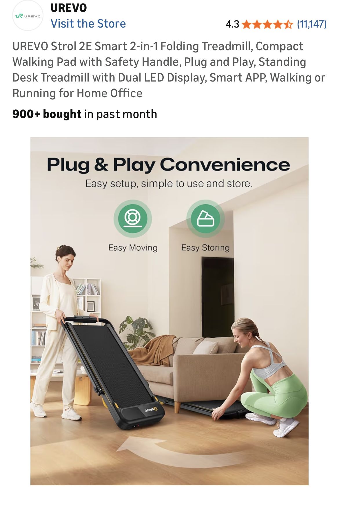 UREVO Strol 2E Smart 2-in-1 Folding Treadmill, Compact Walking Pad with Safety Handle, Plug and Play