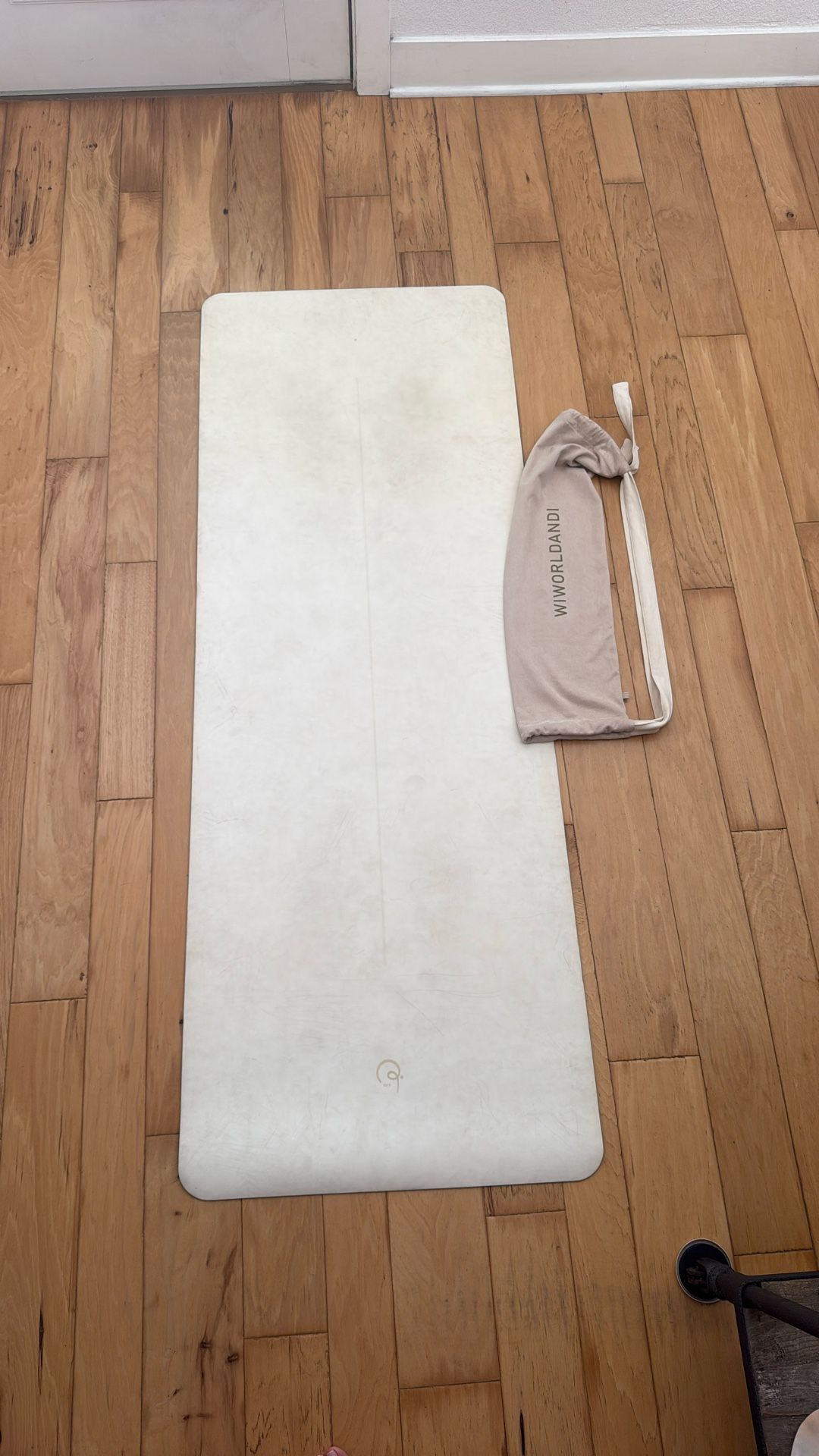 Very sturdy yoga mat. Ivory color. Some marks and stains. Used with love Light weight and nice carrying bag Wiworldandi