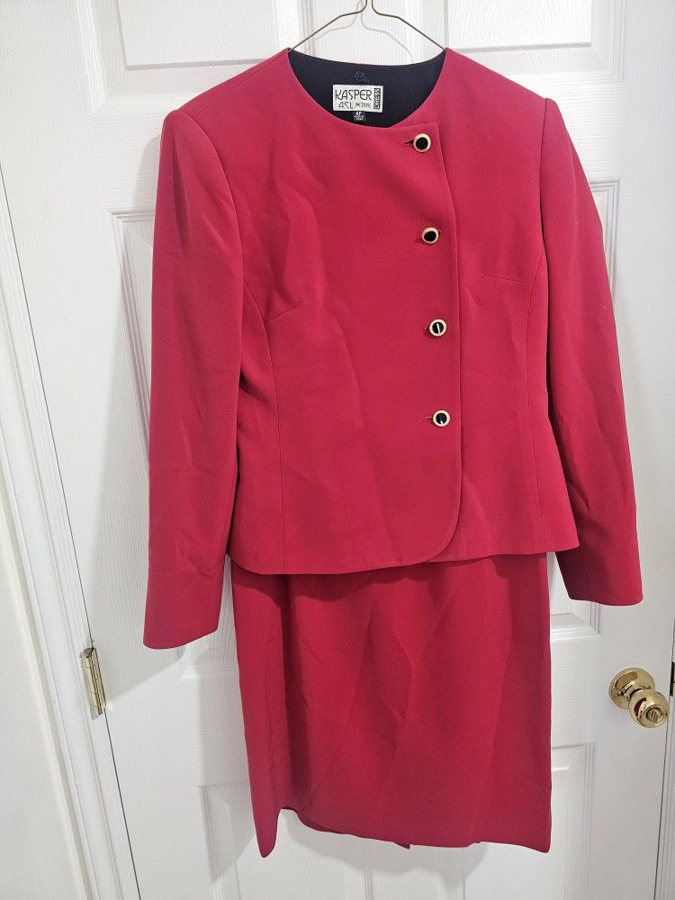 This elegant red skirt suit is perfect for professional and formal occasions. The vibrant color adds a touch of sophistication to your wardrobe. Pre-owned in excellent condition. See pictures for further inspection.