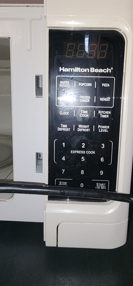 A hamilton beach microwave, works good,has the original glass tray, bought a smaller one for my kitchen, has a color in one corner as shown in the last picture, don't know from where or how it happened, doesn't affect the microwave function itself.