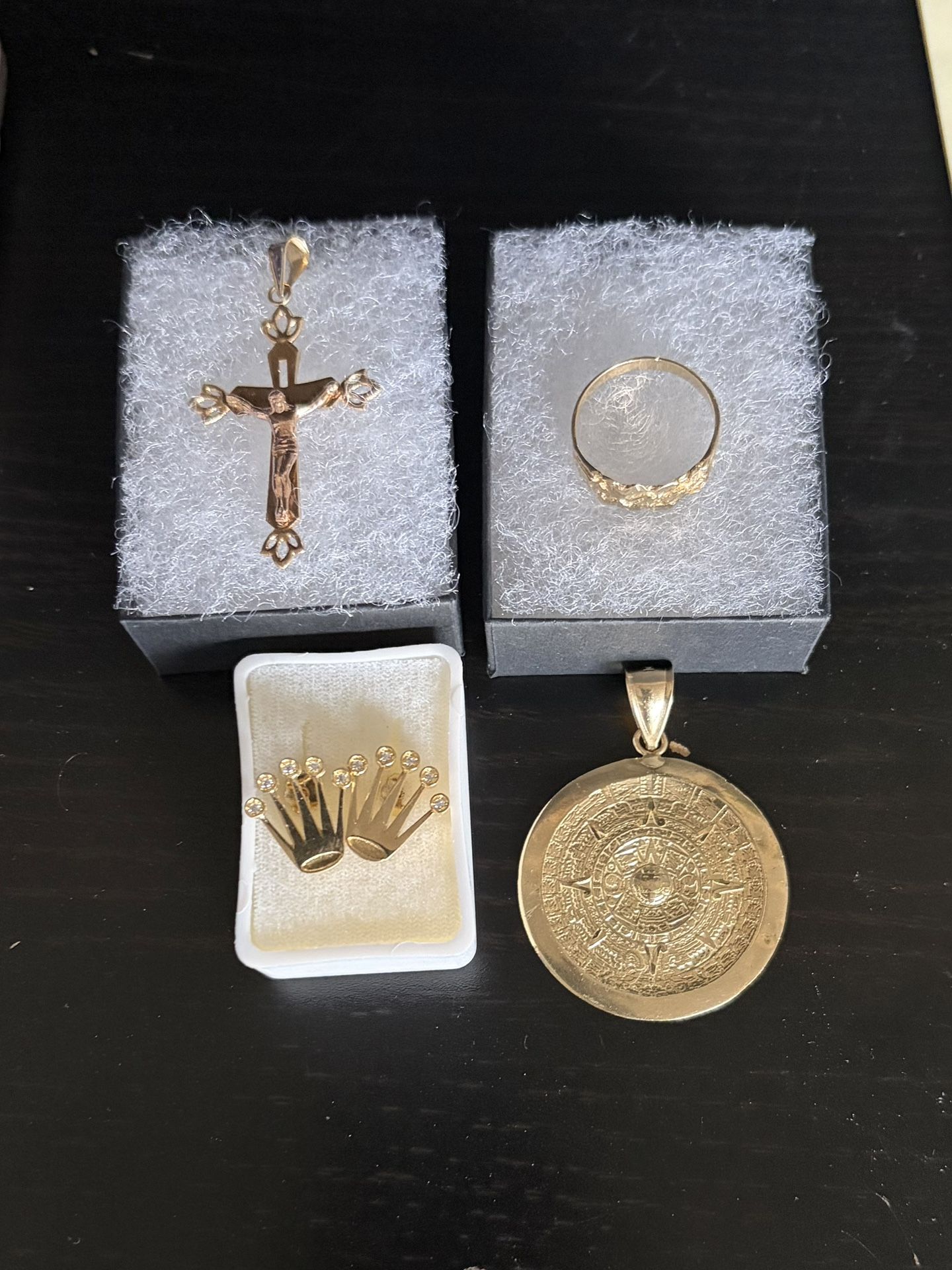 -14k Nugget ring: Size 7, 2.1 gram, $235 -10k Crucifix: 1.75 inches, 1.74 grams, $135 -10k Rolex Crown Earrings: 15mm, 2.7 grams $235 -10k Aztec Calendar Pendant: 2 inches, 4.7 grams, $395 I have acid tester and scale to test the gold or I am always okay with going to a jewelry store I buy and resell gold, prices are firm since I’m not making much. If I don’t have what you are looking for, feel welcome to dm me and ask for something specific and I will try my best to get it for you.