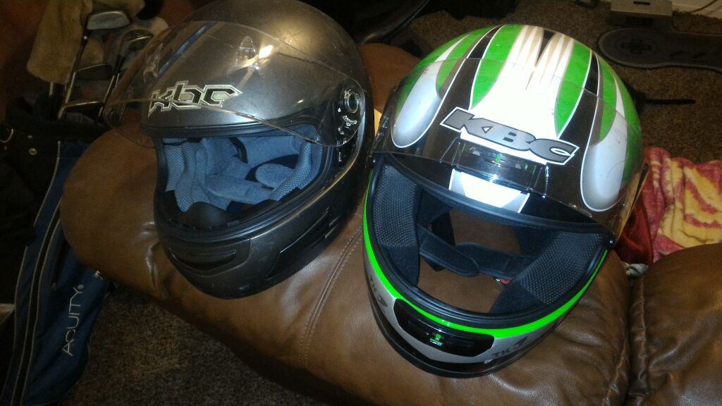 2 KBC motorcycle helmets Black one $40 size XL Green one $50 size L