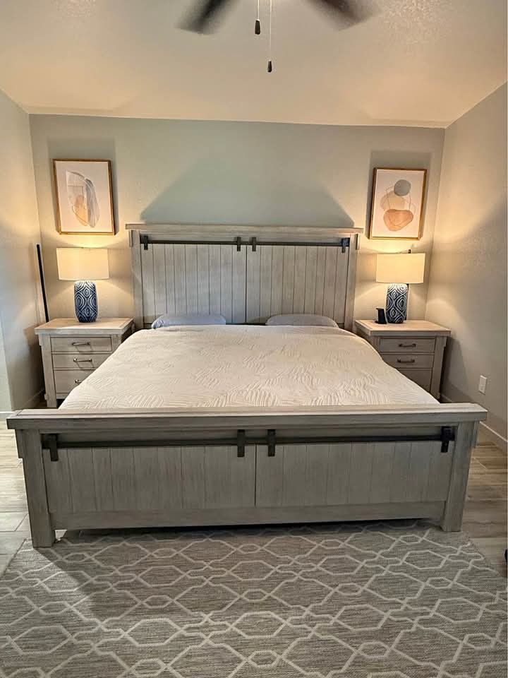 Used-Like New Ashley Furniture Bedroom set (Matress included) Everything still in perfect condition. Only selling because my wife and I are moving soon and need it sold quickly. I'm asking $580 obo for the set. I can help load it if picking up. I can assist with delivery also. King size Bed Frame (Includes Headboard & Footboard) 2 Nights Stands 1 Long Dresser (66x19x40) 1 Tall Dresser (44x20x55.5) 2 Lamps 2 Picures