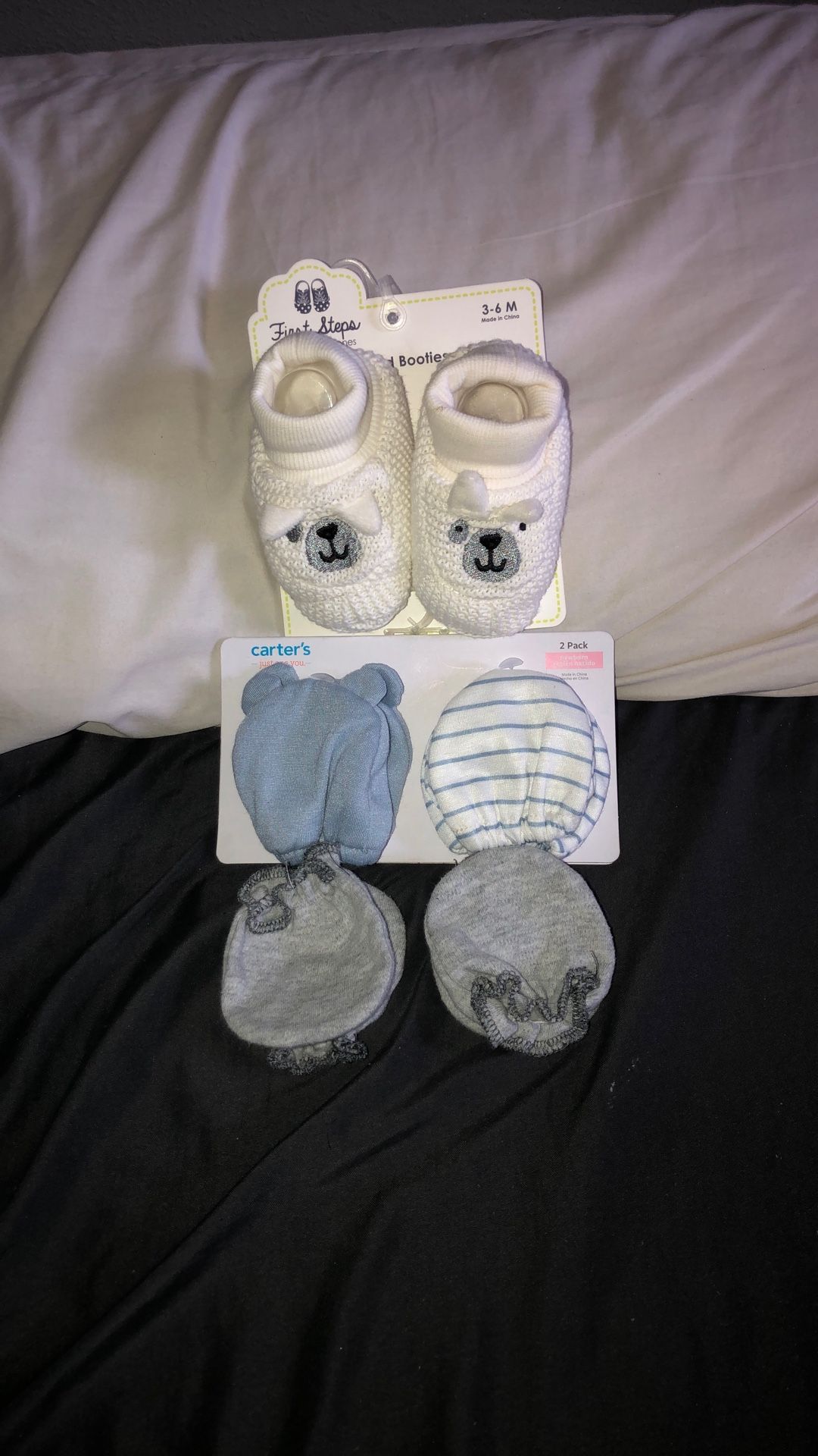 Booties 3-6m $2 2 pack newborn $1 Gray mittens used $1 $4 for all