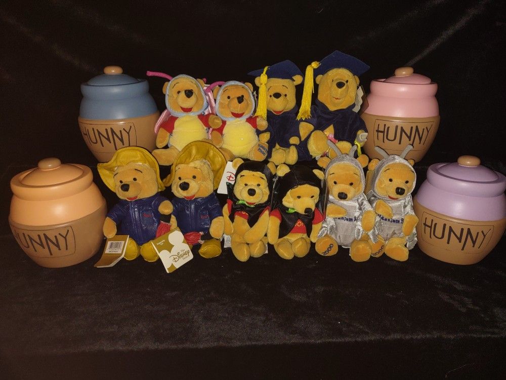Disney plush beanie baby of Winnie the Pooh dressed as different characters storage for the last 35 years tag still attached to them brand new from a smokeless and pet-free home Each Winnie the Pooh for $5.00 each 2 Winnie the Pooh in a Raincoat outfit ☔ 2 Winnie the Pooh in a Dracula's outfit 🦇 2 Winnie the Pooh in a Millennial bug outfit 🦠 2 Winnie the Pooh in a Graduation outfit🧑🏼🎓 Graduation outfit 1 with shorts 1 without.