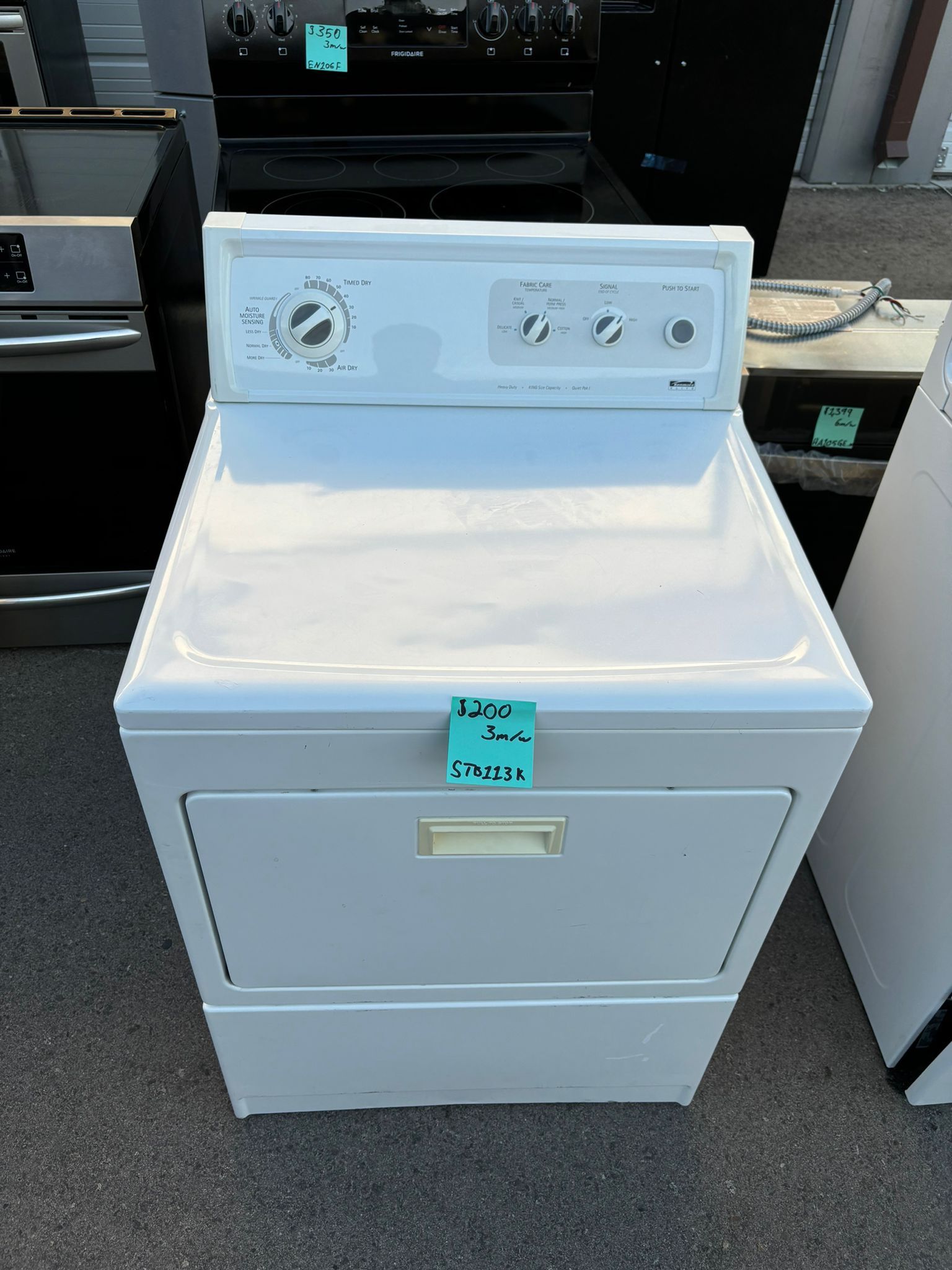 Kenmore elite electric dryer wide its 27 inches wide its been through the tech and have 3 months warranty . Ready to go