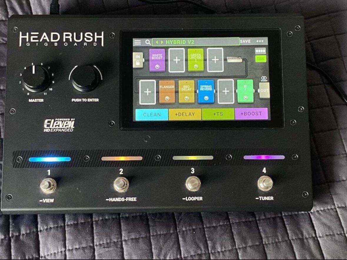 :Looking to trade for a Quest 3 VR Headset: Bought this for a tour that was canceled. Everything is like new, no scratches, no wear, components still have their packaging. Used in studio a few times but never taken out anywhere. Get the incredible sounds and usability of HeadRush in a compact platform. Featuring a finely-tuned quad-core processor and powered by exclusive Eleven HD Expanded DSP software, the HeadRush Gigboard delivers the most versatile, realistic-sounding and responsive amplifier, cabinet, microphone and FX models ever found in a compact, road-ready floorboard guitar FX processor. The 7-inch touch display enables you to touch, swipe and drag-and-drop to instantly create and edit your rigs in an unprecedentedly realistic and intuitive way. Plus, it features gapless preset changes with reverb and delay tail spillover, a built-in looper with 20 minutes of record time, the ability to load custom impulse response files and exclusive original boutique effects that can’t be found anywhere else. Whether you’re looking for a classic warm vintage amp with natural tube drive, wide ambient stereo delay textures with infinite feedback or the heaviest of heavy djent tone, the HeadRush Gigboard covers it all and everything between. 7-Inch Touch Display The heart of the HeadRush Gigboard is the 7-inch touch display and a guitarist-centric, ultra-intuitive user interface – literally touch, swipe and drag-and-drop to instantly create and edit rigs with amazing speed and accuracy. The large display also gives clear feedback when performing live, especially when tweaking tones using the footswitches in "Hands-Free Mode." Everything about the HeadRush Gigboard is designed to make it simple, fast and intuitive to jump right in and create amazing sounding rigs in seconds. Tour Ready Housed in a compact and durable road-ready steel chassis, the HeadRush Gigboard includes many thoughtful features for use on stage, including incredibly bright color, assignable LED strips that show each of the 4 footswitches' status for each rig. You can even drag-and-drop to create set lists (custom orders of rigs) for your gigs. The HeadRush Gigboard is a truly convenient and compact way to bring all of the best classic vintage and modern gear you will ever need to stages near or far, without breaking the bank—or your back. All the Connections You Need The HeadRush Gigboard assimilates seamlessly into your current rig with all the connections you need to handle any performance situation. Combining a 1/4-inch guitar input, (2) 1/4-inch TRS outputs switchable between amp or line level, a 1/4-inch output for headphones, 5-Pin MIDI in/out, plus an onboard 1/4-inch FX loop to integrate pedals and outboard gear at any point in the signal chain. The HeadRush Gigboard also features a pair of 1/4-inch inputs to connect an external expression pedal, and a 1/4-inch external amp output that can be used to change between clean and dirty channels or toggle other settings your amplifier. The HeadRush Gigboard unites your existing equipment while opening up a world of new sonic possibilities. USB Audio and Custom IR Support The Headrush Gigboard’s USB port functions as a USB audio interface that records and re-amps at stunning 24-bit 96kHz quality, and it also works to provide a simple drag-and-drop way to load and back up rigs and other files to and from your computer. Guitarists can also load in their own custom band logo for the lock screen, as well as further expand their available guitar cabinet sounds by loading custom/3rd-party impulse response files. HeadRush teamed up with Celestion to include an exclusive download right in the box to get you started, but the HeadRush Gigboard also supports all common wave formats (wav, aiff), sample rates (up to 192kHz) and bit depths (up to 32-bit).
