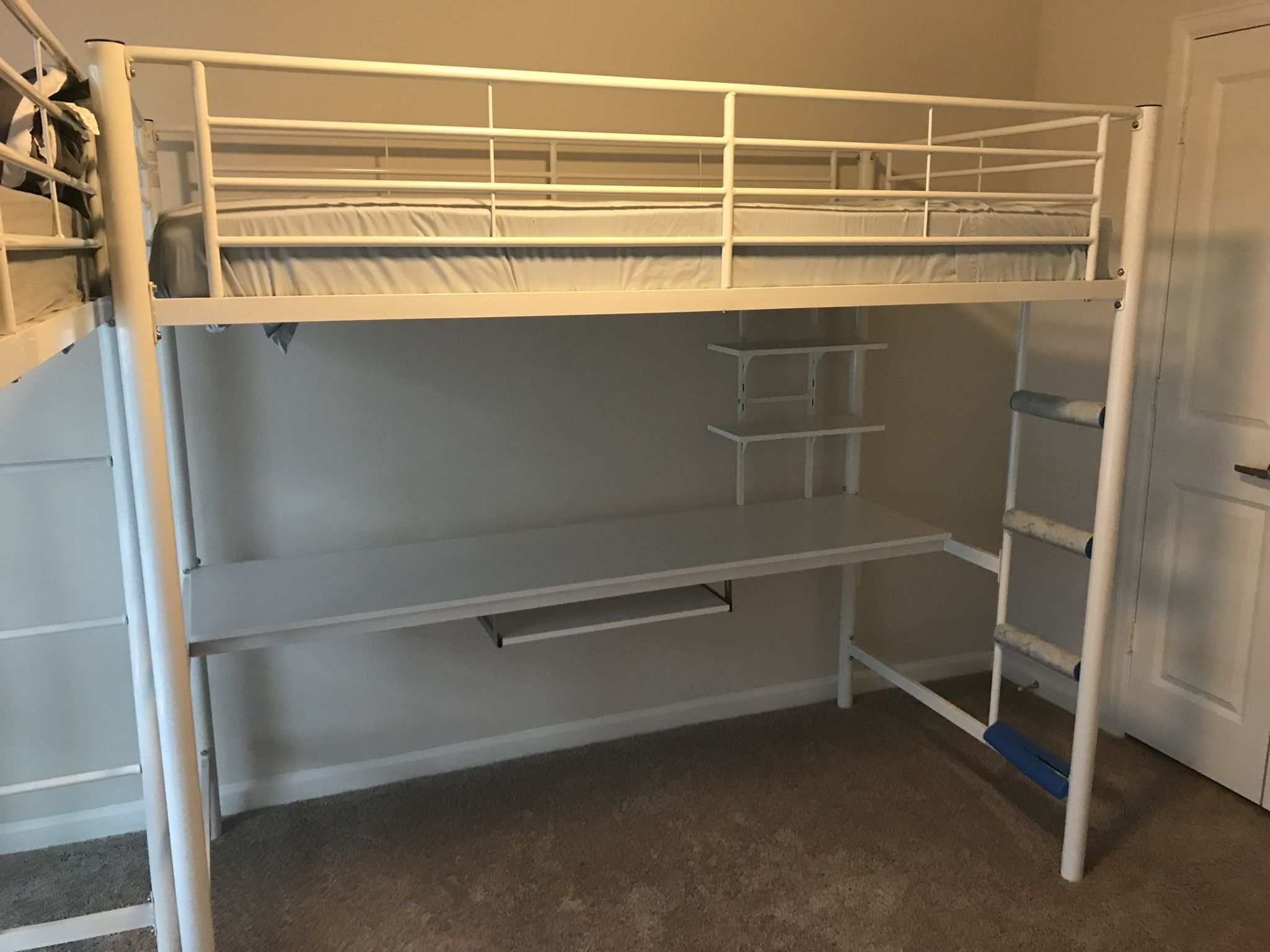 2 Twin Loft Beds with Desks, Mattresses and Bedding