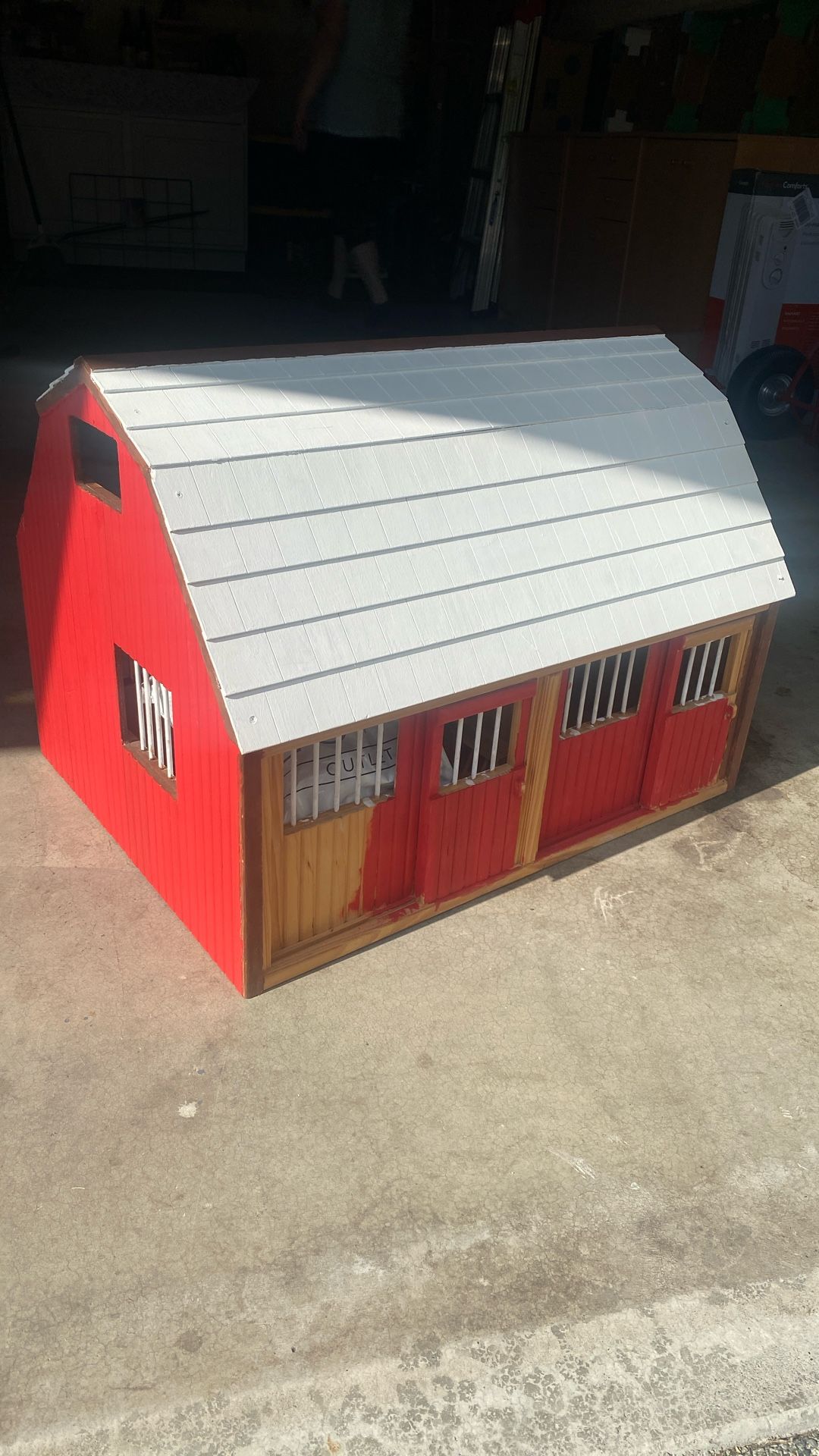 Breyer brand animal barn real wood. It’s half painting and comes with the paint to finish painting. Does have minor damage of wood chipped, but for those creative it’s an easy fix.