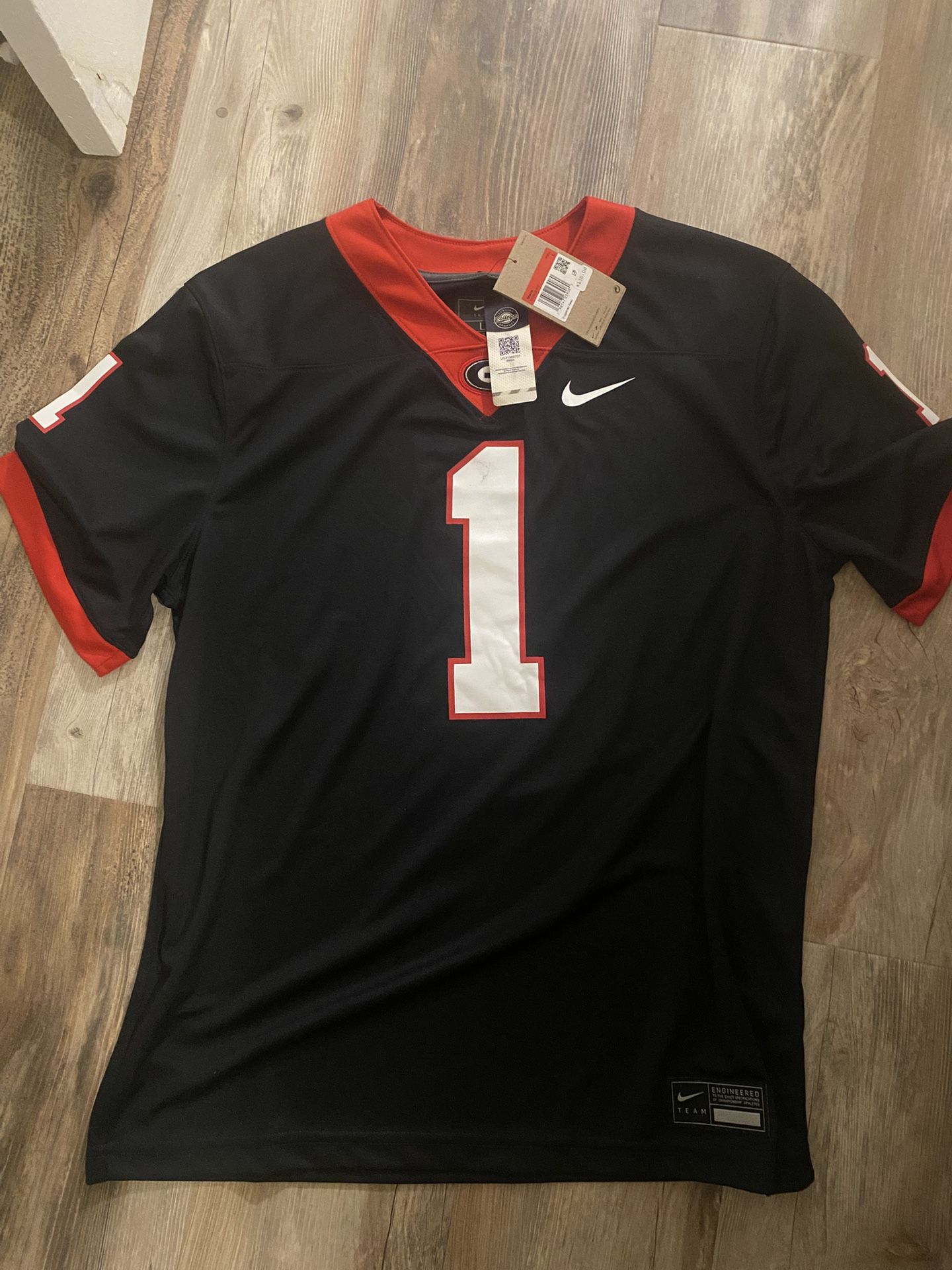 brand new with tags Georgia Bulldogs football jersey size Large. does have flaw on the number but what’s it matter when you’ll be spilling beer all over it.