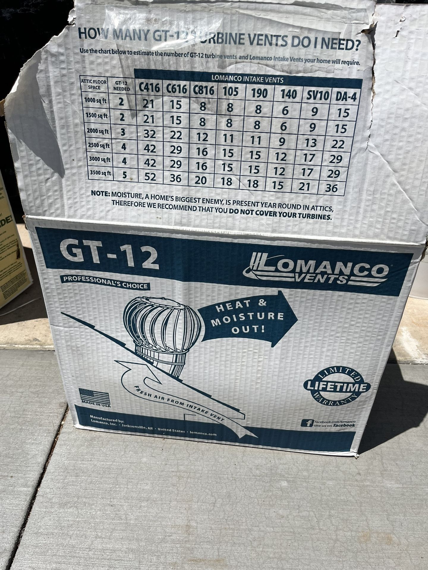 12 inch turbo roof vent. Open Box never installed. Sells for 40 will take 25