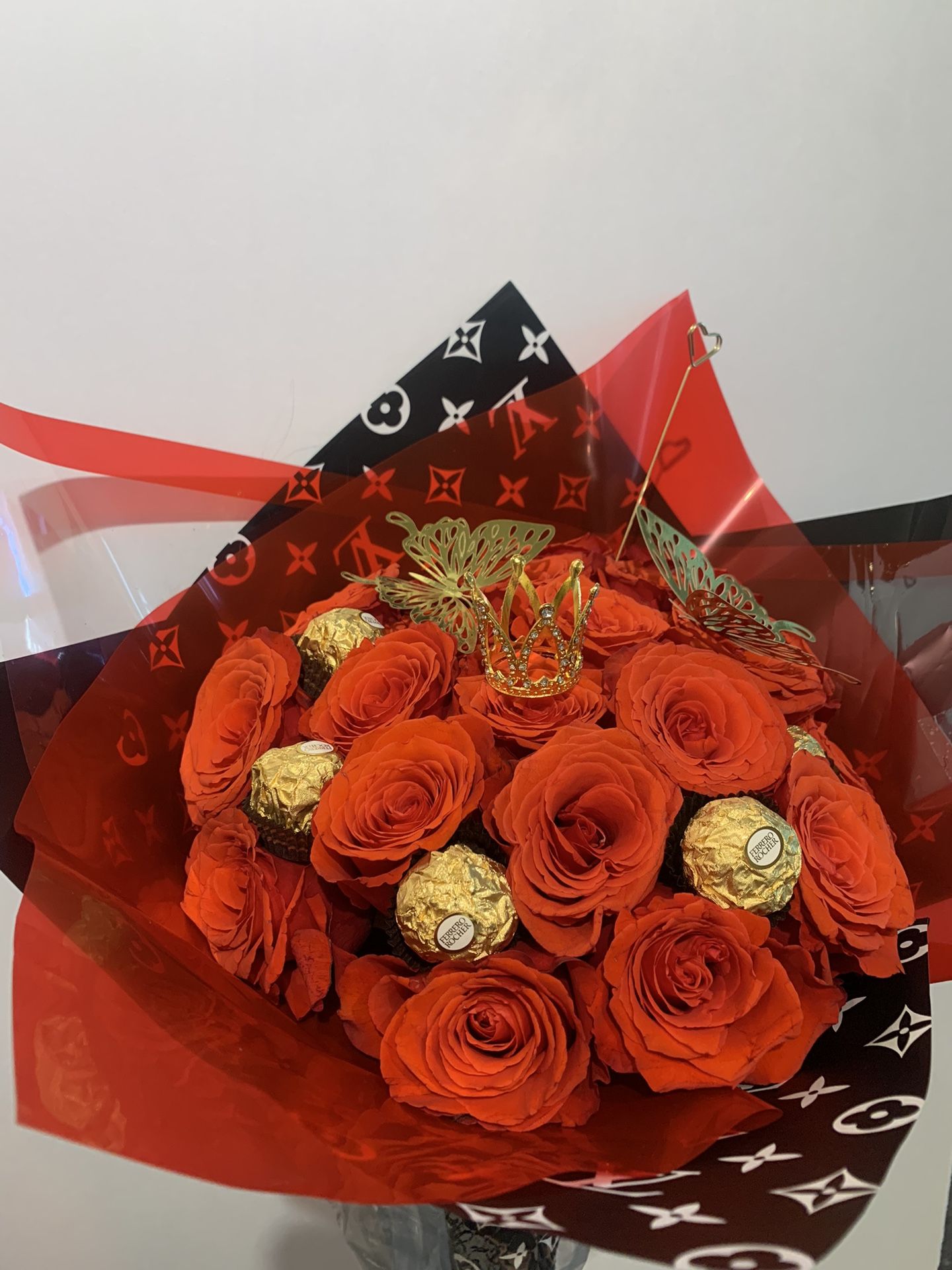 Truly unique floral arrangement a cut above the rest. These arrangements are crafted using 50 cm long stem Ecuadorian Roses. No fillers such as babies breath, foliage, or thorns. Exquisite design floral paper available in : Louis Vuitton, black or brown or purple, mint green or navy blue. Gucci, pink and white or yellow and white. Chanel black and gold, black and white or pink and white . One dozen without queen package is $80 Two dozen without package is $120 Queen package includes Rocher, butterflies, crown and golden stem for cards at $25 add on fee to any one arrangement.