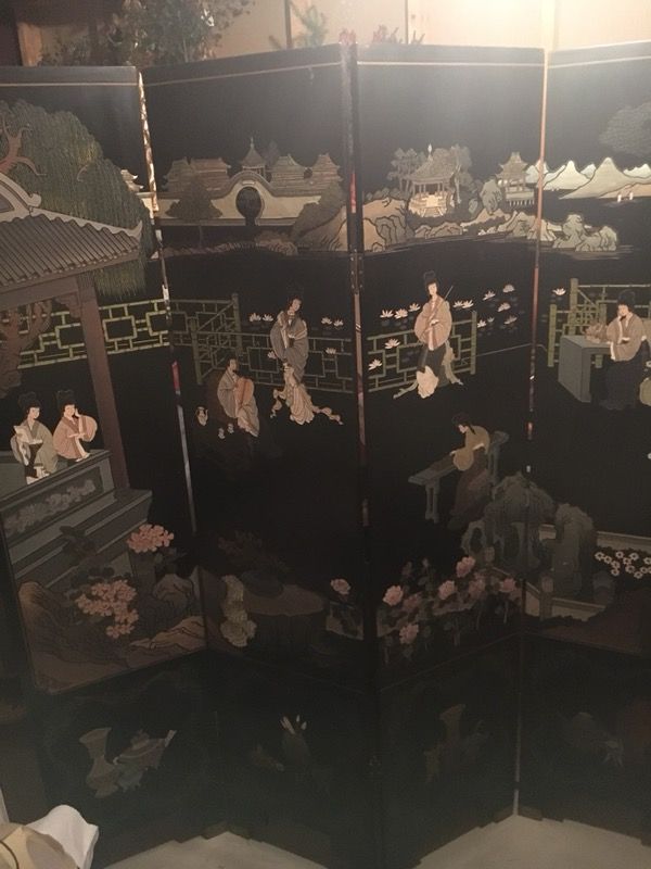 Wood coromandel folding screen made in Tianjin, China. Is solid wood, four panel, hand carved, and hand painted on both sides. Panel has brass hinges. In great condition