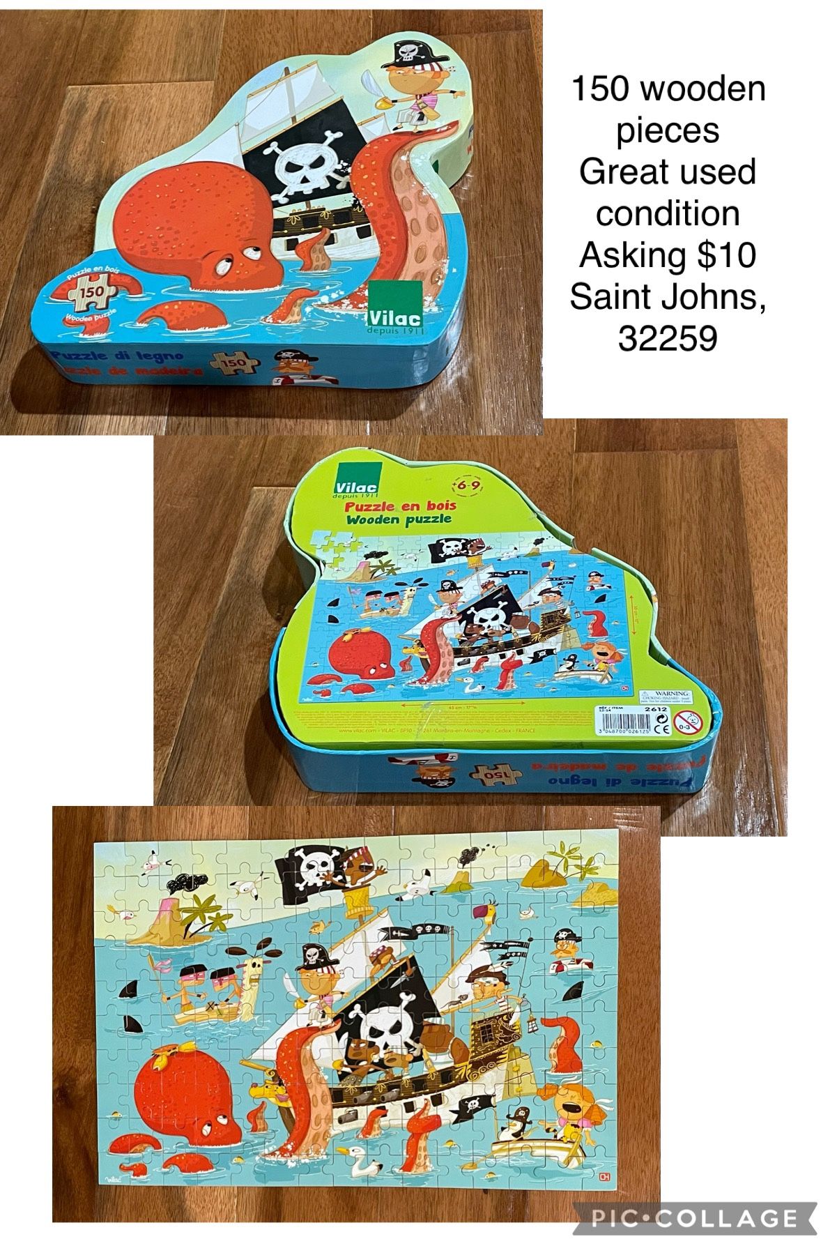 Pirate puzzle, 150 pieces (box says ages 6-9). High quality, wooden pieces. Great used condition, was put together one time, maybe twice (no missing pieces). Asking $10. Located in Saint Johns (32259).