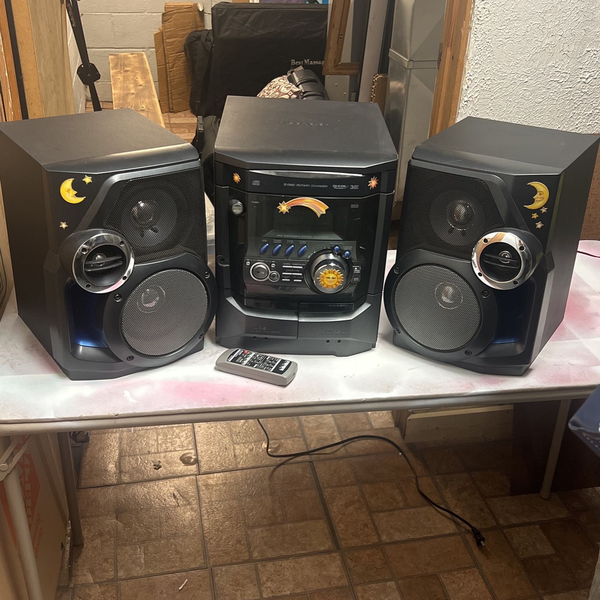 SHARP 3 disc CD player Rotary changer AM/FM radio Aux & cassette tape I’ve had this thing forever and it seriously has yet to disappoint lol You can plug your smartphone into the cassette deck (which I have to go w it) and everything still functions right. Speakers are not blown.