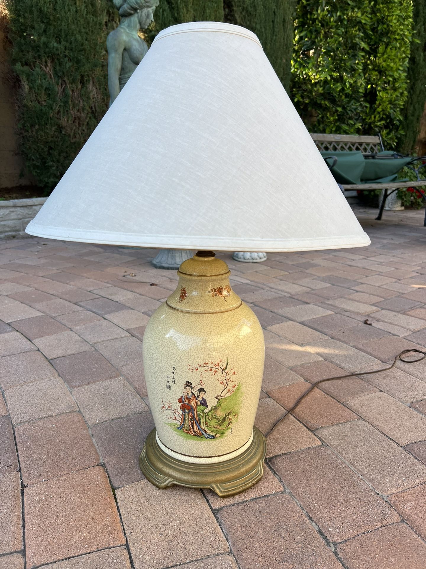 This mid century Chinoiserie table lamp is made from crackled porcelain and comes in a ginger jar design with gold colored wood base. It depicts an Asian style scene, with 2 female figures among a cherry blossom background. It is estimated to be Chinese (by the writing) but could also be of Japanese inspiration. Approximate measurements are: Lamp: 28.5" H x 10" W Shade: 21" W The lamp itself - and accompanying linen shade - is in excellent condition with no chips or cracks. The rotary switch near the top has had some trouble connecting to the power source, so it will need to be replaced/rewired. The price has been adjusted accordingly. This is cash only, pick-up only. Please message me with any questions. Thank you!