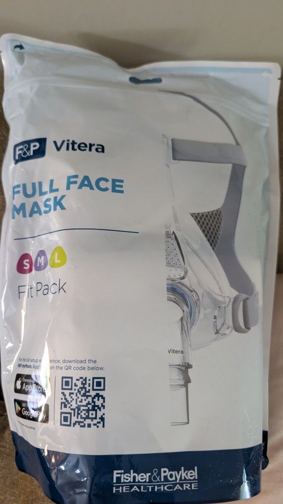 Key Features: Model: F&P Vitera Full Face PAP Therapy Mask. Fit Pack: Includes multiple cushion sizes (Small, Medium, and Large) to ensure you find the perfect fit. Condition: Brand new in sealed packaging. Includes: Mask frame, headgear, and all three cushion sizes. The Vitera mask is known for its RollFit XT seal and breathable VentiCool headgear, designed to remain stable and comfortable throughout the night.