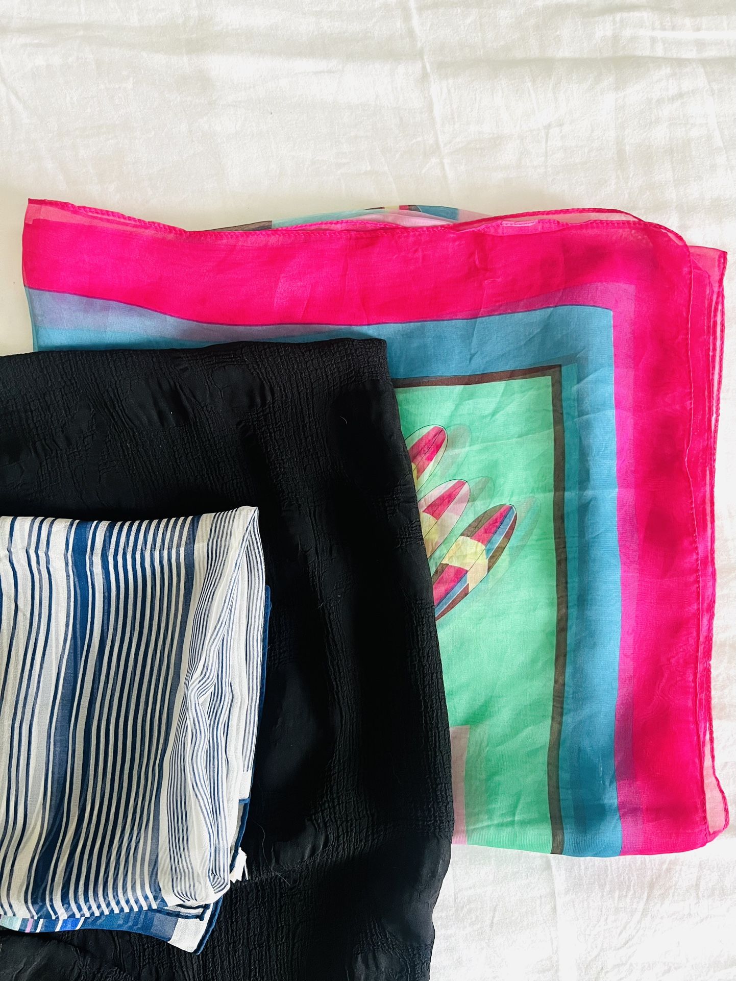 Set of 3 women’s scarfs. Good used condition 1. Colorful pink blue green with bright patterns 54”x54” 2. Black with floral patterns and ruffles 64”x21” 3. Square blue stripes 30”x30”