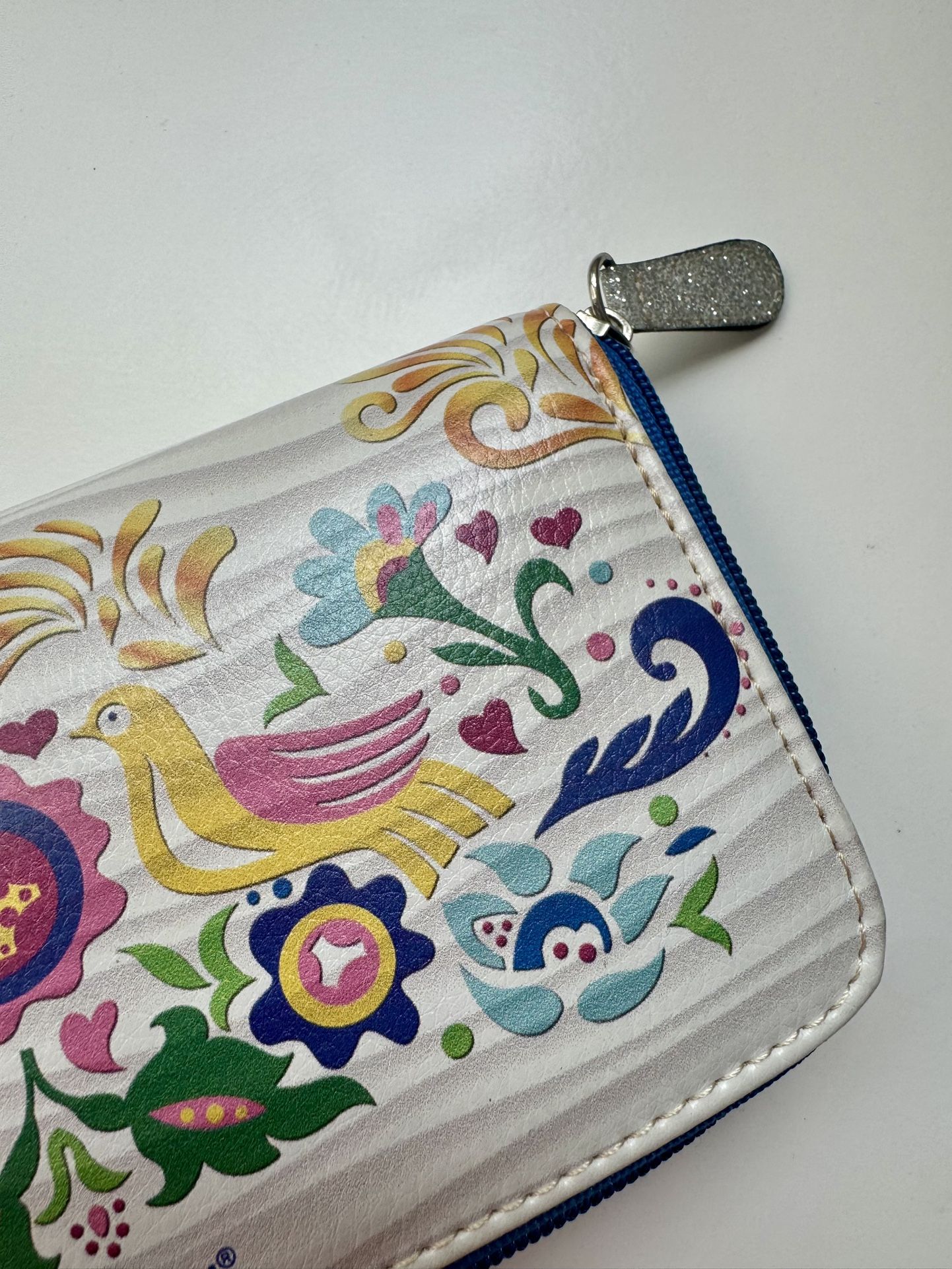 Vibrant wallet with floral and bird design. Features a multicolor pattern with a silver zipper pull. Aprox : 7.5” x 4” New without tags