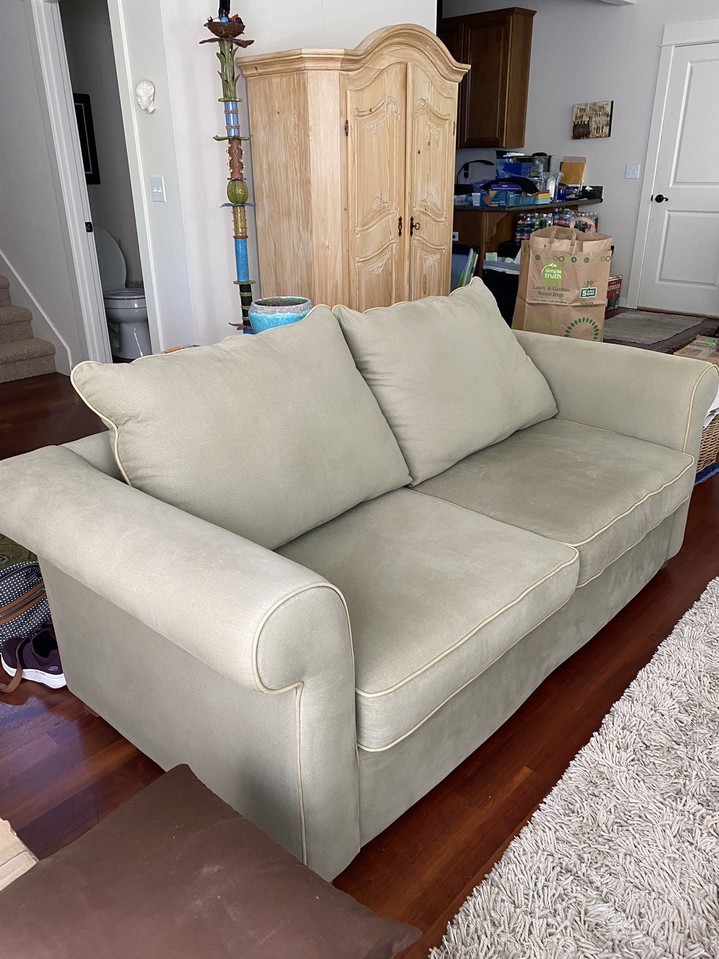 Super quality sofabed used only as a couch. Bed has never been used! Sofa is Light moss green/gray color with piping trim. Love Seat Cushions in super condition. One small tear on arm from movers. Seat depth 25” Sofa back height is 26.5” Length is 76” $150 OBO