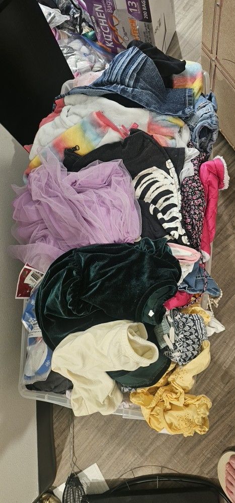 Sizes range from 18months to XS girls. And then some juniors/womens clothing. Tub included in purchase. Downsizing. Also be adding more to tub.