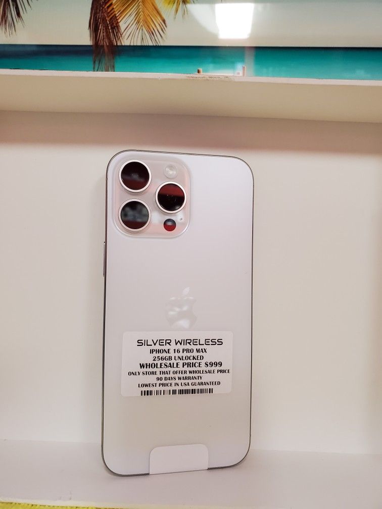 IPHONE 16 PRO MAX PERFECT CONDITION 256GB FACTORY UNLOCKED FINANCE AVAILABLE 50 DOWN PAYMENT 90 DAYS WARRANTY SILVER WIRELESS 1610 E CHARLESTON SUITE 110