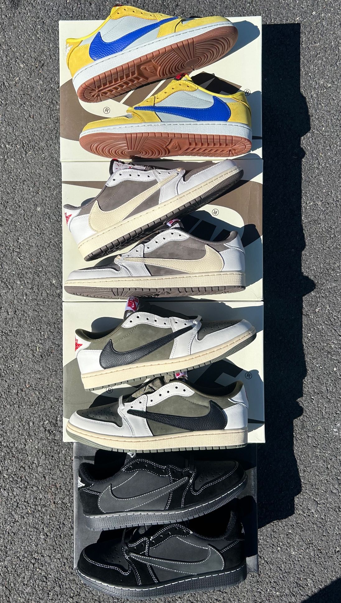 •Jordan 1 OG SP Travis Scott Canary Size: 8 •Jordan 1 Travis Scott Reverse Mocha Size: 10 •Jordan 1 Travis Scott Medium Olive Size: 10 •Jordan 1 Travis Scott Black Phantom Size: 8 / 9 ❌ - 💰 $150 each Includes all extra laces 👟 📍 Local meetups in Long Beach 🚚 Local delivery available ($20) 💳 Cash • Zelle • Apple Pay