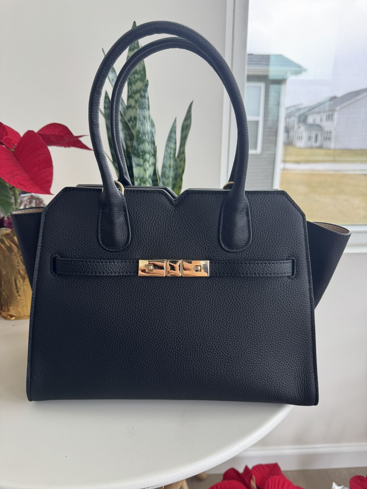Sleek black structured handbag made from genuine Italian leather. Features gold-tone hardware and a clean, minimalist silhouette that elevates any outfit. Perfect for everyday wear, work, or dressing up a casual look. Holds its shape beautifully and feels high quality. #luxurybag Please look the pictures if you have any question don’t hesitate to contact us.
