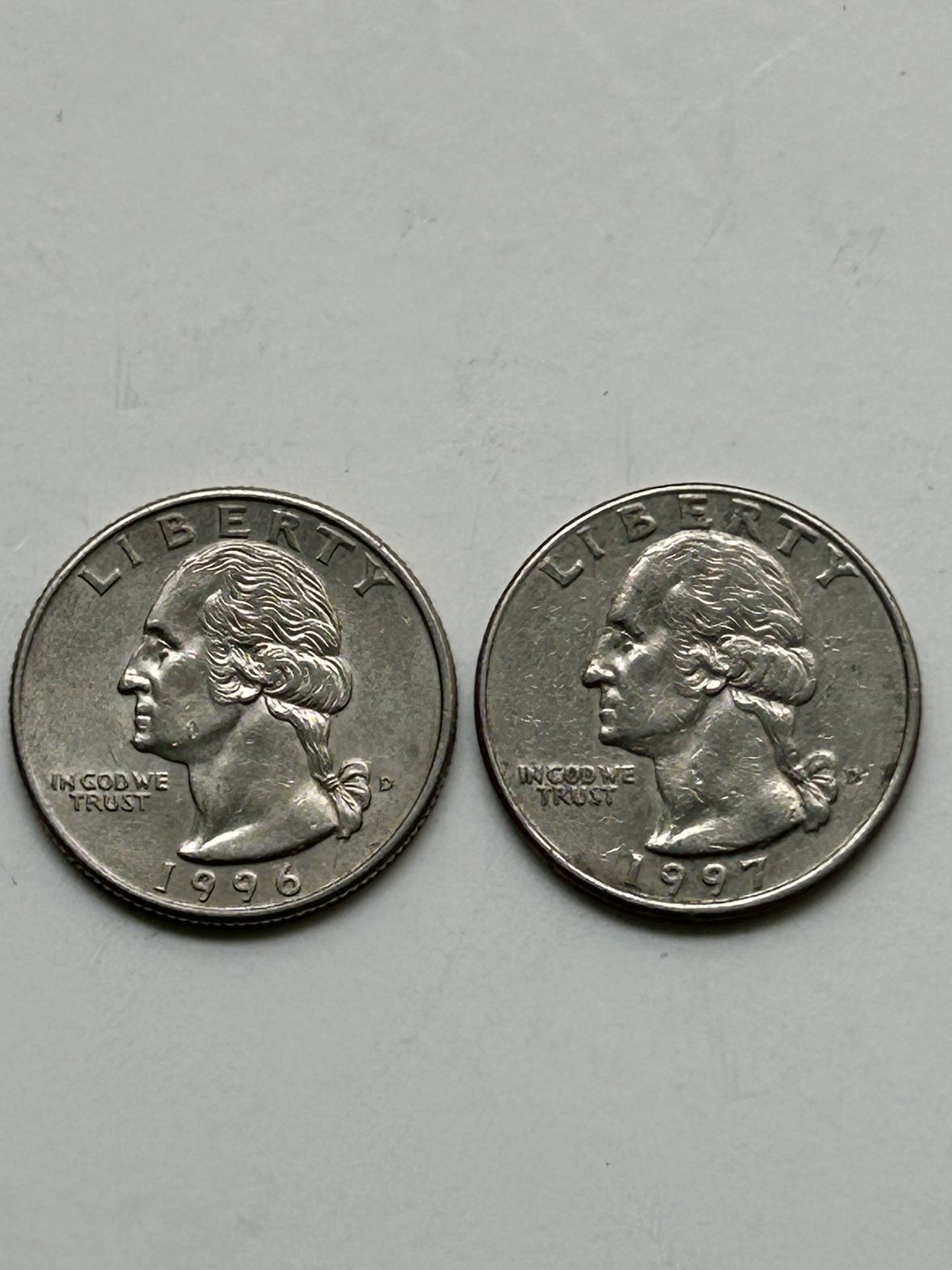 The product is a lot of 2 circulated 1996D and 1997D Washington Quarters. These coins have a denomination of 25 cents, are composed of copper, struck as business coins in Denver, and are uncertified. They are part of the Washington series of coins minted in the United States