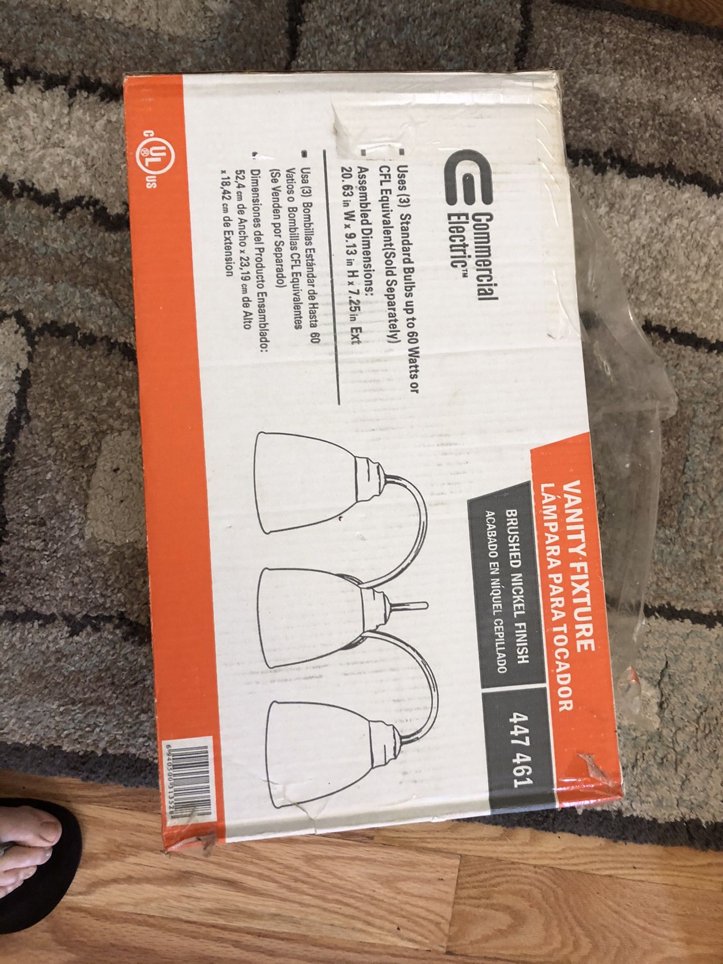 3 lamp vanity light, brushed nickel with frosted glass. New in the box, never installed.